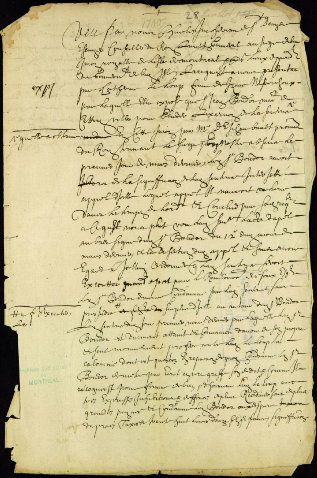- Ce dossier de matière criminelle est composé des pièces suivantes : le procès-verbal d'enquête demandé par Catherine Leloup contre Abraham Bouat et Jacques Boudor ; l'enquête avec comparution et déposition des témoins, au cours de laquelle Jean Boudor témoigne ; les conclusions du procureur du roi ; le dictum de sentence, qui absout Bouat et condamne Boudor à mettre par écrit qu'il reconnaît la demanderesse comme étant une femme d'honneur ; et le jugement confirmant que la sentence est exécutoire, nonobstant le fait que Boudor loge un appel. Les témoins sont les officiers François de Margane, de Batilly et Joseph de Fleury de LaGorgendière et le marchand Louis Landron Dombourg, âgé de 22 ans