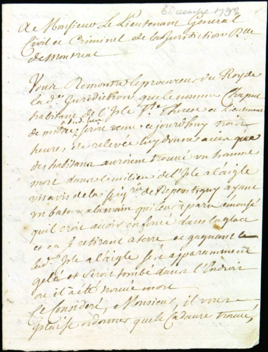 - Ce dossier de matière criminelle est composé des pièces suivantes : la requête pour faire transporter à la geôle le cadavre d'un homme mort, trouvé dans les glaces à l'île à l'Aigle, vis à vis la seigneurie de Repentigny, et de procéder à son examen et à la tenue d'une enquête ; l'ordre de transporter le cadavre à la geôle, de tenir une enquête et d'assigner les témoins ; le commandement à Nicolas Gervaise de donner tous les services pour faire transporter le cadavre moyennement le paiement des frais ; le procès-verbal de l'examen du cadavre et de l'identification faite par son oncle, Larchevêque dit Paquet, lequel reconnaît son neveu Joseph Samson ; le certificat du chirurgien Joseph Istre, lequel conclut au décès accidentel par chute à travers la glace ; l'information judiciaire ; le procès-verbal de l'ouverture et de l'inventaire d'un coffre appartenant au défunt, lequel coffre se trouvait chez Jean Jeanne, navigateur ; la requête [...]
