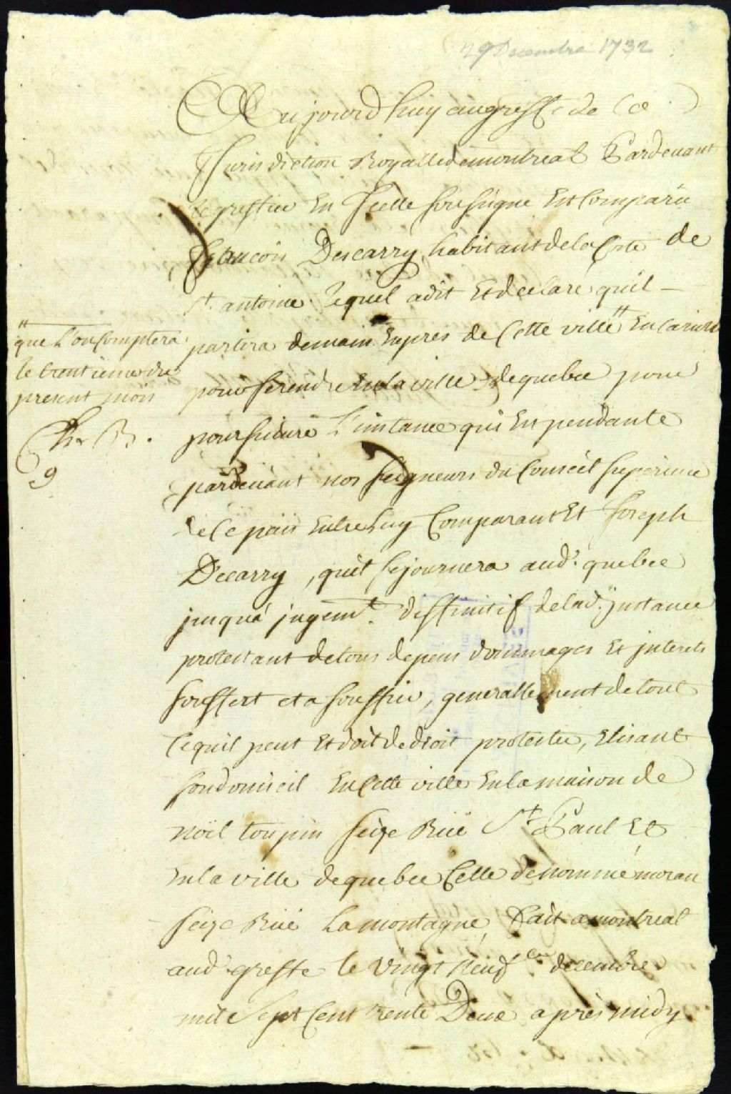 - Ce dossier de matière civile est composé de la pièce suivante : l'acte de départ pour Québec, enregistré au greffe de Montréal par François Descaries, poursuivant l'instance au Conseil Supérieur contre Joseph Descaries