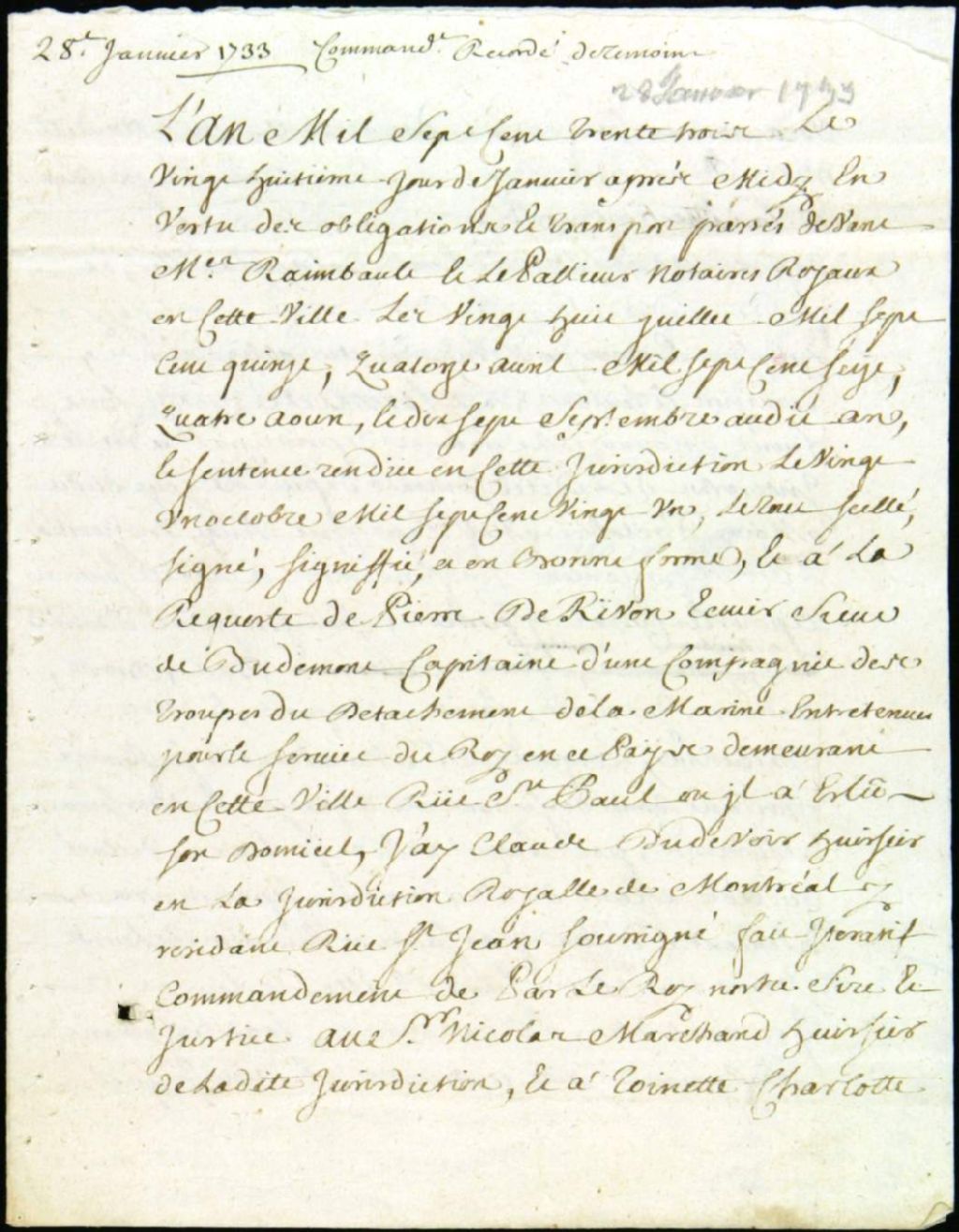 Procès entre Pierre Derivon de Budemont, capitaine, demandeur, et Nicolas Marchand, époux d'Antoinette-Charlotte Beaumont, défendeur, pour la saisie et la vente d'une maison sur la rue Saint-Paul, 28 janvier 1733 - 9 février 1735, Archives nationales à Montréal, Fonds Juridiction royale de Montréal, (06M,TL4,S1,D4002).