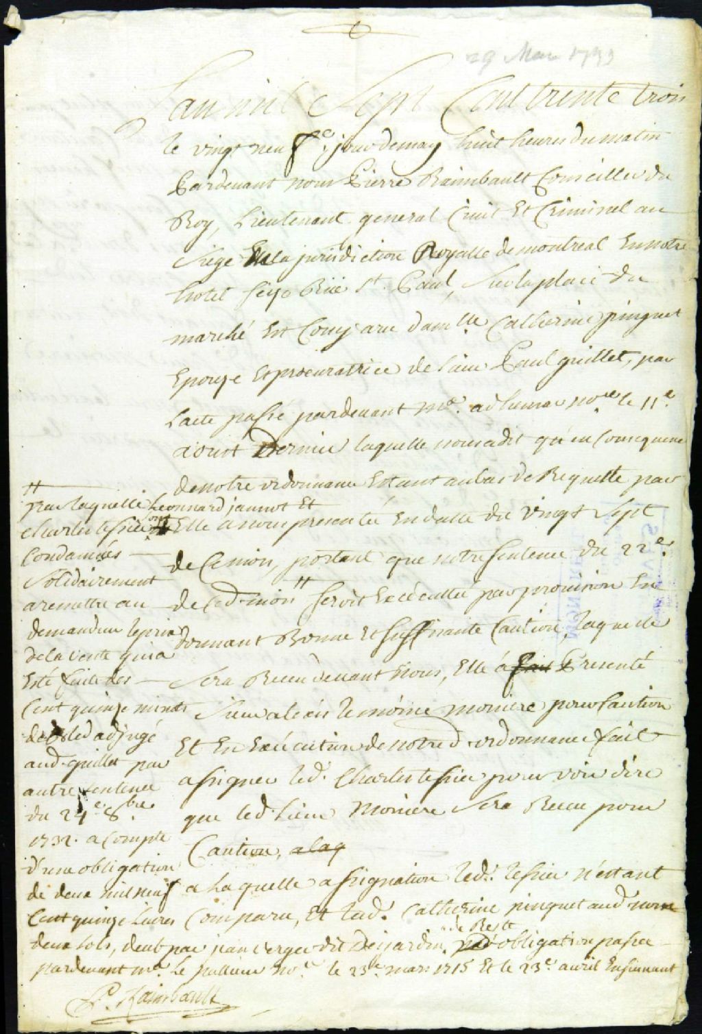 - Ce dossier de matière civile est composé des pièces suivantes : la sentence de réception de caution judiciaire d'Alexis Lemoine, sieur Monière, présentée par Catherine Pinguet, en tant que procuratrice de son mari, Paul Guillet, pour l'exécution d'une sentence rendue le 22 mai 1733 contre Charles Tessier ; et la soumission de la caution au greffe par Alexis Lemoine Monière