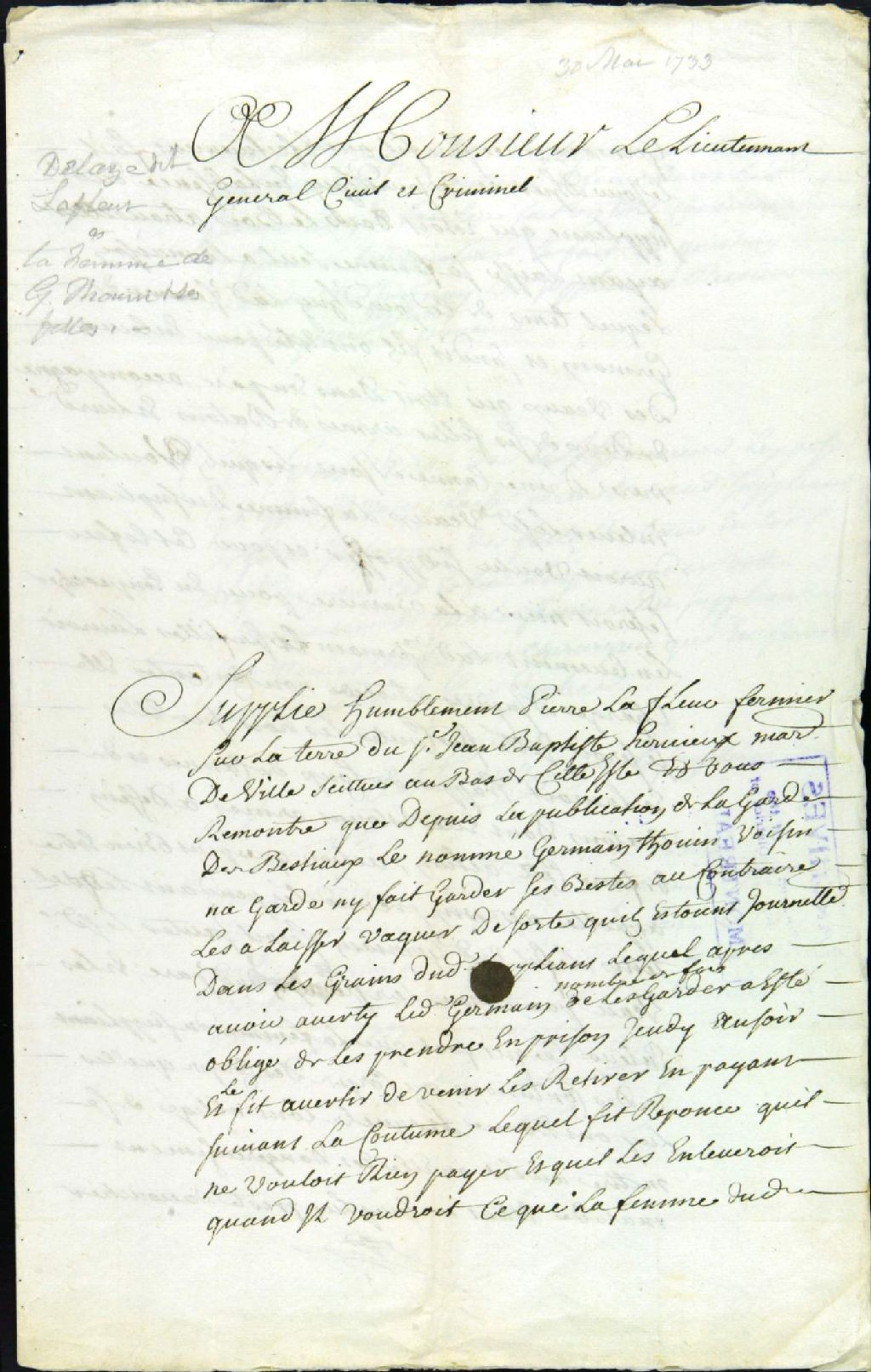 - Procès entre Pierre Delasse dit Lafleur, fermier de Jean-Baptiste Hervieux, plaignant, et la femme et les filles de Germain Thouin, accusées de voies de fait sur la femme du plaignant, laquelle est enceinte
