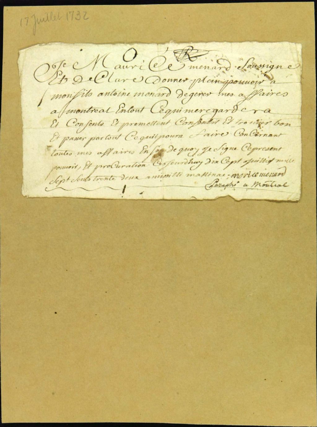 - Procès entre Maurice Ménard, de Michillimakinac, demandeur, et Louis Ménard dit Lafontaine, François Brunet et Jacques Rivière, défendeurs, pour le recouvrement d'une dette