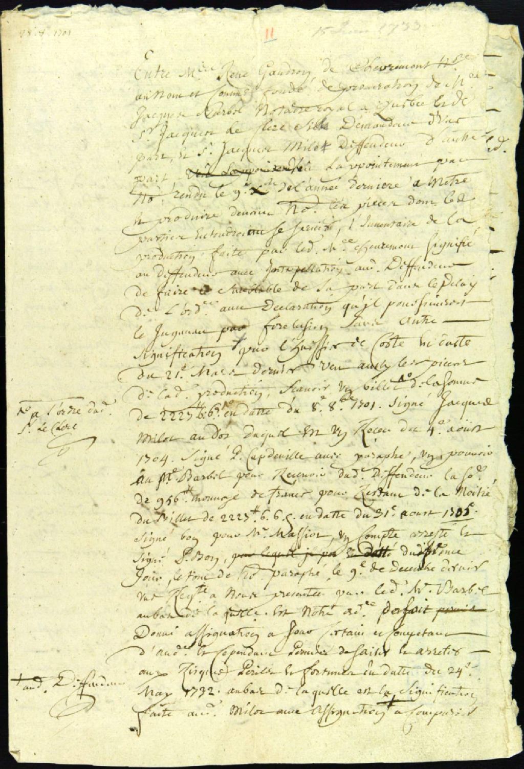 - Ce dossier de matière civile est composé des pièces suivantes : la sentence qui accorde la mainlevée d'une saisie faite par René Gaudron de Chevremont, fondé de pouvoir de Jacques Barbel et Jacques Leclerc, fils, sur les biens de Jacques Milot, comme étant illégale ; l'appel de sentence par Jacques Leclerc, logé au greffe de la Juridiction royale de Montréal ; et l'acte de départ logé au greffe de Montréal par Jacques Milot, disant se rendre au Conseil Supérieur de Québec afin de poursuivre l'instance contre Jacques Leclerc, fils