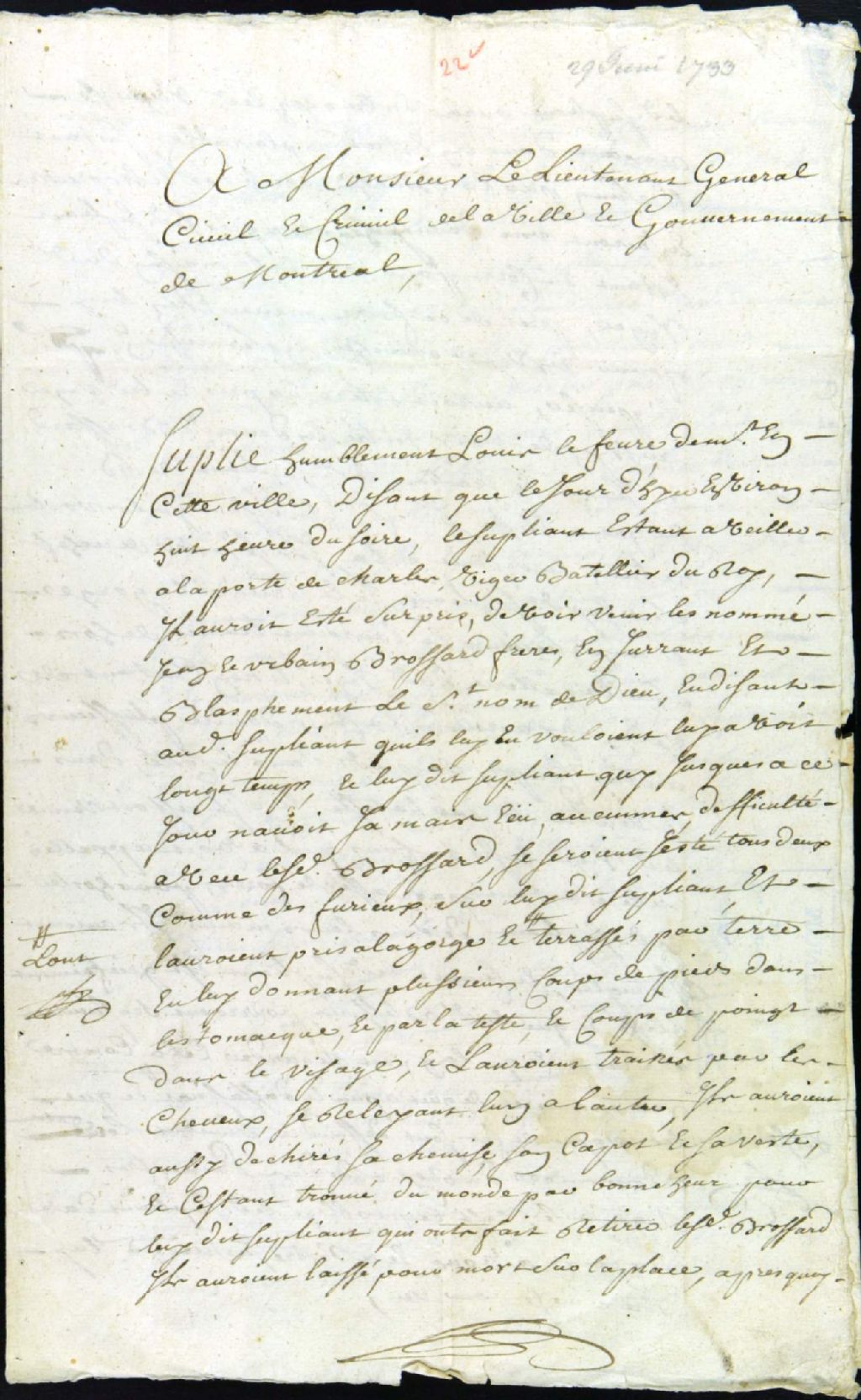 - Ce dossier de matière criminelle est d¿abord composé de la requête de Louis Lefebvre pour la tenue d'une information judiciaire contre Jean-Baptiste, 26 ans, et Urbain Brossard, 22 ans, lesquels l'ont battu et roué de coups chez Charles Viger, charpentier des bateaux du roi, âgé de 65 ans. Il demande aussi de se faire visiter par un chirurgien et le versement d'une pension alimentaire, étant incapable de travailler. Le dossier contient ensuite : la permission de tenir une information et de se faire visiter par le chirurgien Sullivan ; l'ordre d'assigner les témoins ; l'information judiciaire ; la communication au procureur du roi, lequel requiert la comparution des accusés ; la procuration de Louis Lefebvre à l'huissier Decoste pour le représenter ; la requête de ce dernier pour procéder à la prise de serment des arbitres Istre et Sullivan ; l'ordonnance pour faire assigner les frères Brossard ; et leurs interrogatoires subséquents.Le dossier est aussi composé des pièces suivantes : le certificat des chirurgiens Istre et Sullivan ; le réquisitoire pour convertir le procès criminel en procès civil ; la sentence qui condamne les frères Brossard à cinquante livres de réparation civile plus les frais de justice ; le mémoire de frais ; la requête de Louis Lefebvre disant que Jean Brossard est déjà parti pour les pays d'en haut, que son frère est sur le point de partir et demandant conséquemment de faire comparaître Urbain Brossard pour qu¿il reçoive la caution proposée par le baron de Longueuil et le faire emprisonner jusqu'au paiement de son amende ; l'assignation à Urbain Brossard ; la soumission de caution par Lemoine, baron de Longueuil et major de Montréal, au greffe ; le jugement par défaut contre Brossard, non comparant ; et les défenses faite aux frères Brossard de se retirer dans les pays d'en haut et aux chefs de canots de les embarquer.Les documents mentionnent les témoins suivant : Charles Lemaitre dit Auger, capitaine de la milice à Yamachiche, âgé de 64 ans ; Madeleine Lefebvre, âgée de 28 ans, épouse de Charles Viger, fils ; Rolland Paradis, orfèvre de la rue Saint-Paul, âgé de 35 ans ; Françoise Guertin, âgée de 56 ans, épouse de Charles Viger, père ; Catherine Viger, âgée de 16 ans, fille de Charles, père ; Thérèse Viger, âgée de 21 ans, épouse de François Filiau dit Dubois, menuisier ; Charles Viger, fils, charpentier des bateaux du roi, âgé de 32 ans ; et François Filiau dit Dubois, menuisier, âgé de 33 ans. Riday dit Beauceron, cordonnier, qui loge Louis Lefebvre, est aussi cité