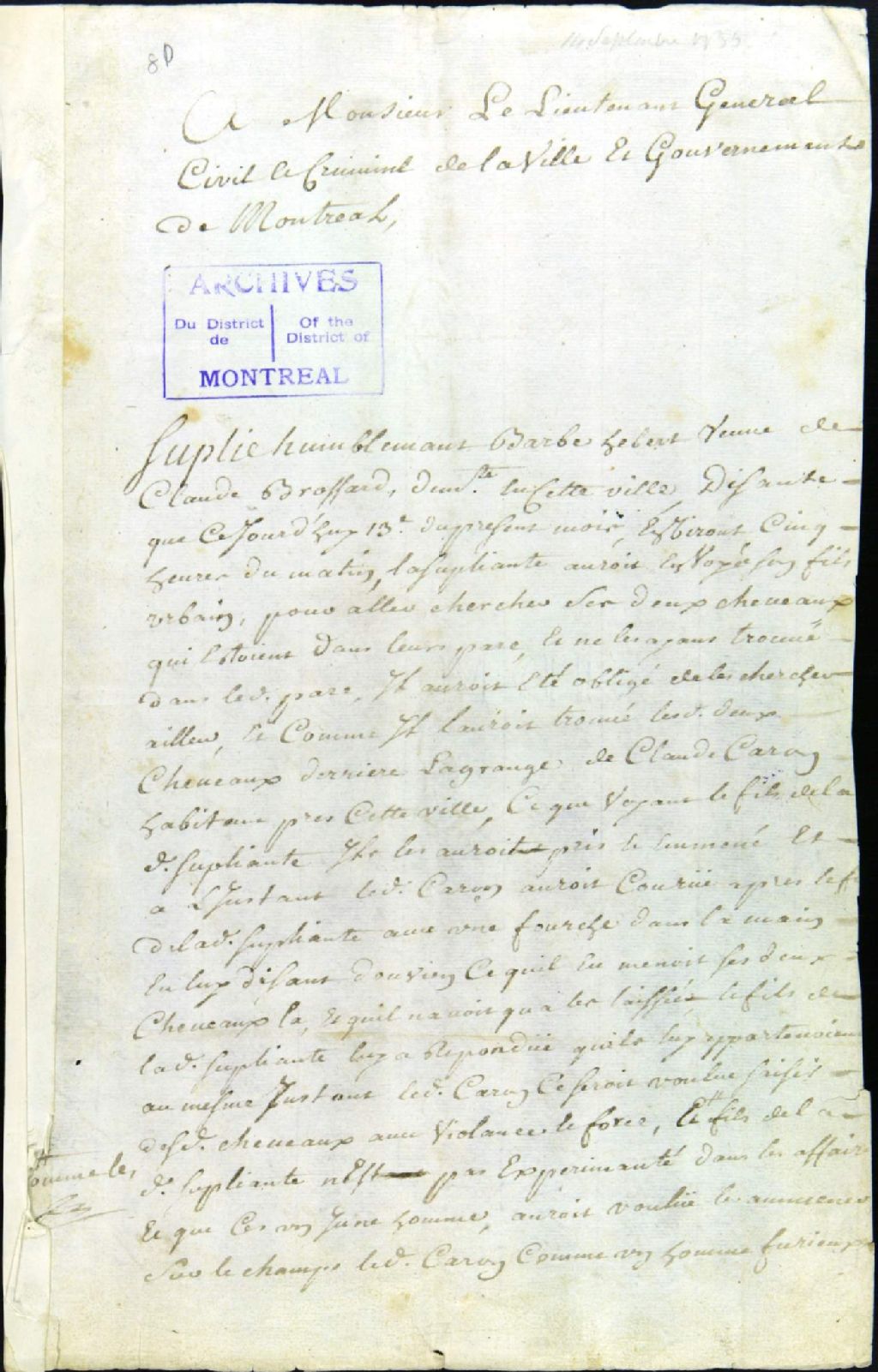 - Ce dossier de matière criminelle est composé des pièces suivantes : la plainte de Barbe Hébert, au nom de son jeune fils Urbain Brossard, lequel aurait été frappé à coups de fourche par Claude Caron et ses deux fils Joseph et Jean, alors qu'il tentait de prendre deux de ses chevaux retenus par Caron, sous prétexte de dommages faits dans ses champs de blé ; la permission de faire informer et de faire examiner le jeune Urbain par un chirurgien ; l'ordonnance pour faire assigner les témoins de la poursuite ; l'information judiciaire ; la communication au procureur du roi, lequel requiert de convertir le procès au civil ; le rapport d'Istre, chirurgien, sur l'état du jeune Urbain Brossard ; l'ordre de faire comparaître Claude Caron ; le rapport de l'assignation faite à ce dernier, en parlant à sa fille Marguerite ; l'interrogatoire de Claude Caron ; la sentence qui condamne ce dernier à trente livres de réparation civile ; le mémoire des frais de justice ; l'acte de départ de Claude Caron pour le Conseil Supérieur ; la sentence ordonnant la réception de J.-B. Maret dit Lépine comme caution judiciaire pour Brossard ; et la soumission de caution judiciaire par Maret, au greffe. Joseph Poirier, époux de Demers Chefdeville, tisserand, âgé de 31 ans, est cité comme témoin