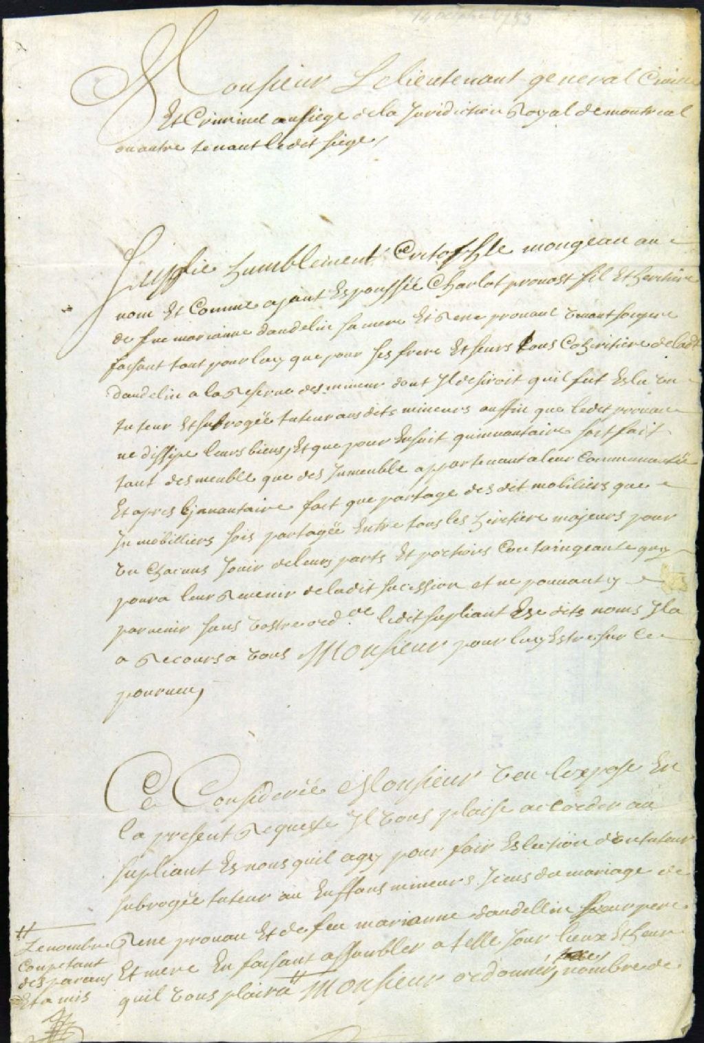 - Ce dossier d'administration judiciaire est composé de la pièce suivante : la requête de Christophe Mongeau, pour tenir une réunion de parents et amis en vue de faire élire un tuteur aux enfants mineurs de René Provost ; et la permission de tenir assemblée