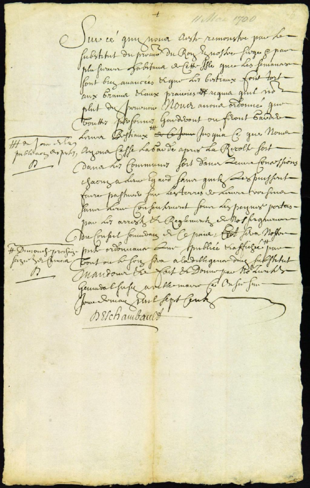 Ordonnance du lieutenant général de la Juridiction de Montréal concernant la garde des bestiaux jusqu'à la fin des récoltes, 11 mai 1700, Archives nationales à Montréal, Fonds Juridiction royale de Montréal, (06M,TL4,S1,D411).