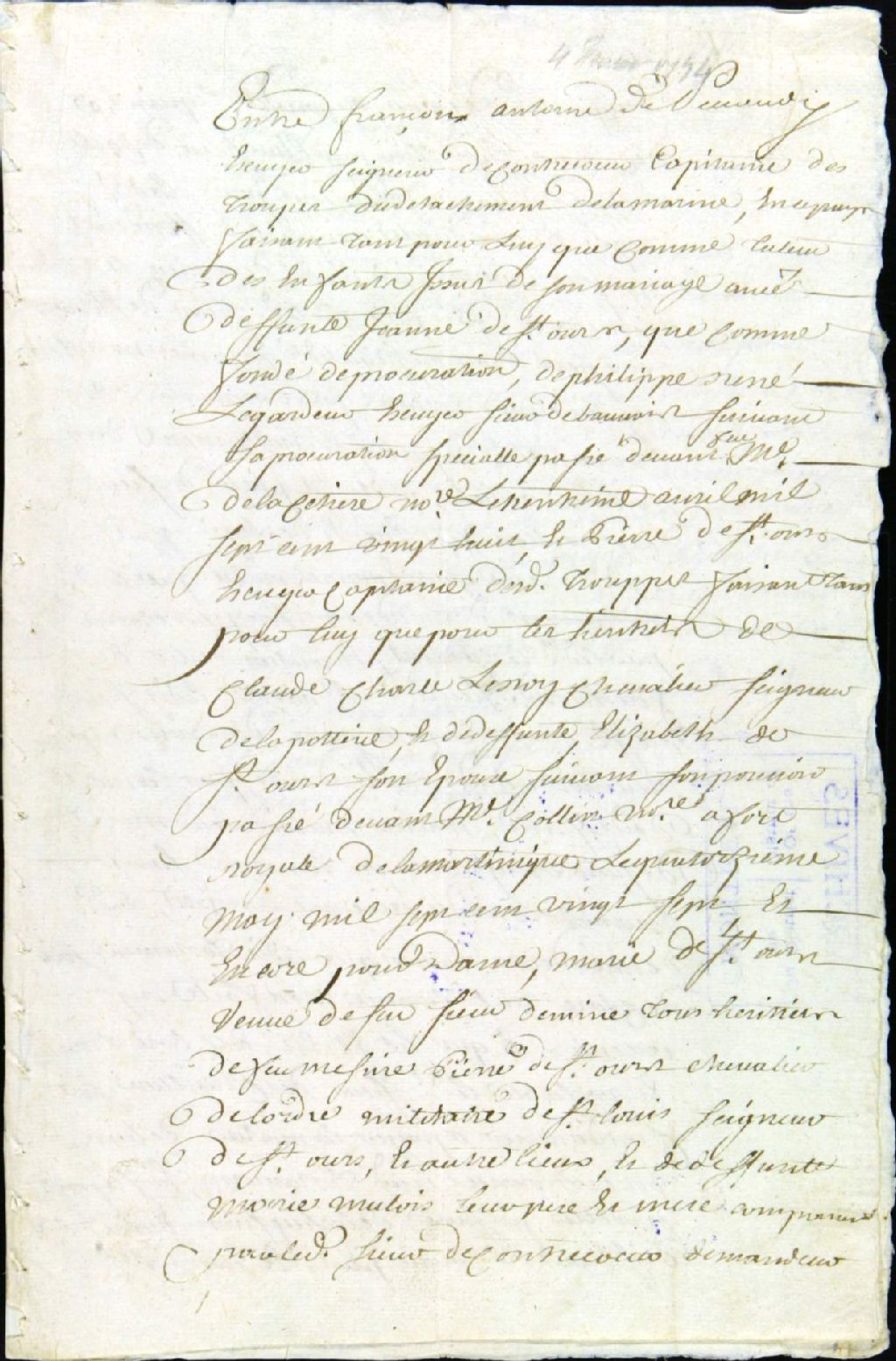 - Procès entre François-Antoine de Pécaudy, seigneur de Contrecoeur, veuf de Jeanne de Saint-Ours et tuteur des enfants issus de leur mariage, Philippe-René Legardeur, sieur de Beauvais, Pierre de Saint-Ours, capitaine, Claude-Charles Leroy de LaPotherie, veuf d'Élisabeth Saint-Ours, et Marie de Saint-Ours, veuve de Jean de Mines, demandeurs, et Jean-Baptiste de Saint-Ours, sieur Deschaillons, seigneur de Saint-Ours, défendeur, pour le règlement d'une succession