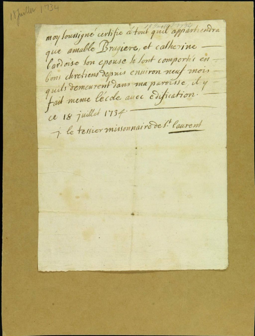 Attestation de bonne moeurs pour le couple Amable Brugière et Catherine Lardoise par J. Letessier, 18 juillet 1734, Archives nationales à Montréal, Fonds Juridiction royale de Montréal, (06M,TL4,S1,D4160).