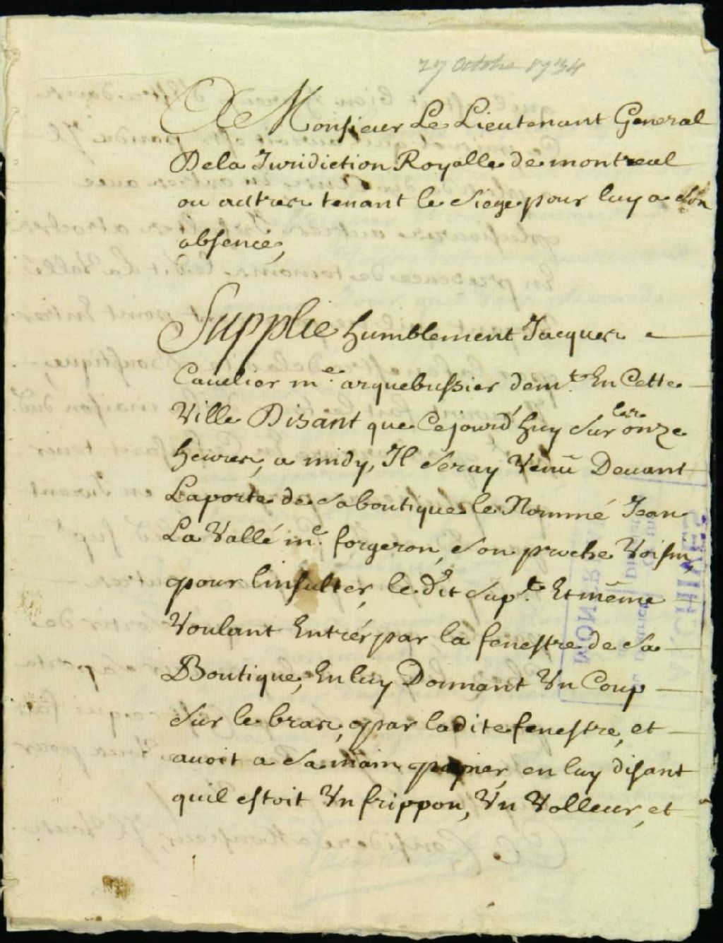 - Ce dossier de matière criminelle se compose des pièces suivantes : la plainte de Jacques Cavelier contre Jean Bouchard dit Lavallée, âgé de 37 ans, représenté par sa femme Marie Tessier, pour insultes devant témoins. Il demande réparation d'honneur ; la permission pour la tenue d'une information judiciaire ; l'ordonnance pour assigner les témoins ; l'information judiciaire ; le réquisitoire pour faire comparaître Bouchard ; l'ordonnance pour faire comparaître Bouchard ; l'assignation ; la requête de Jean Bouchard dit Lavallée, émise par sa femme Marie Tessier, pour être entendu plus tôt qu'à la date de sa comparution, étant donné qu'il doit se rendre à Côte-Vertus, où se trouve ses fourneaux à charbon ; la signification de l'accord du lieutenant général ; l'interrogatoire de Bouchard ; les conclusions du procureur du roi commis ; et la sentence qui condamne Bouchard aux frais de justice avec défense de récidiver.Les témoins dans cette affaire sont : Françoise Lemire dit Marsolet, 29 ans, épouse de François Auger ; François Massou, soldat de la Compagnie de Repentigny et écrivain chez Porlier ; François Beaumont, 19 ans, fils d'Antoine ; Pierre Hostain dit Marineau, forgeron de 26 ans ; Pierre Voisin dit Lacroix, sergent de la Compagnie DuVivier, âgé de 61 ans ; et Jean Biron, qui est récusé