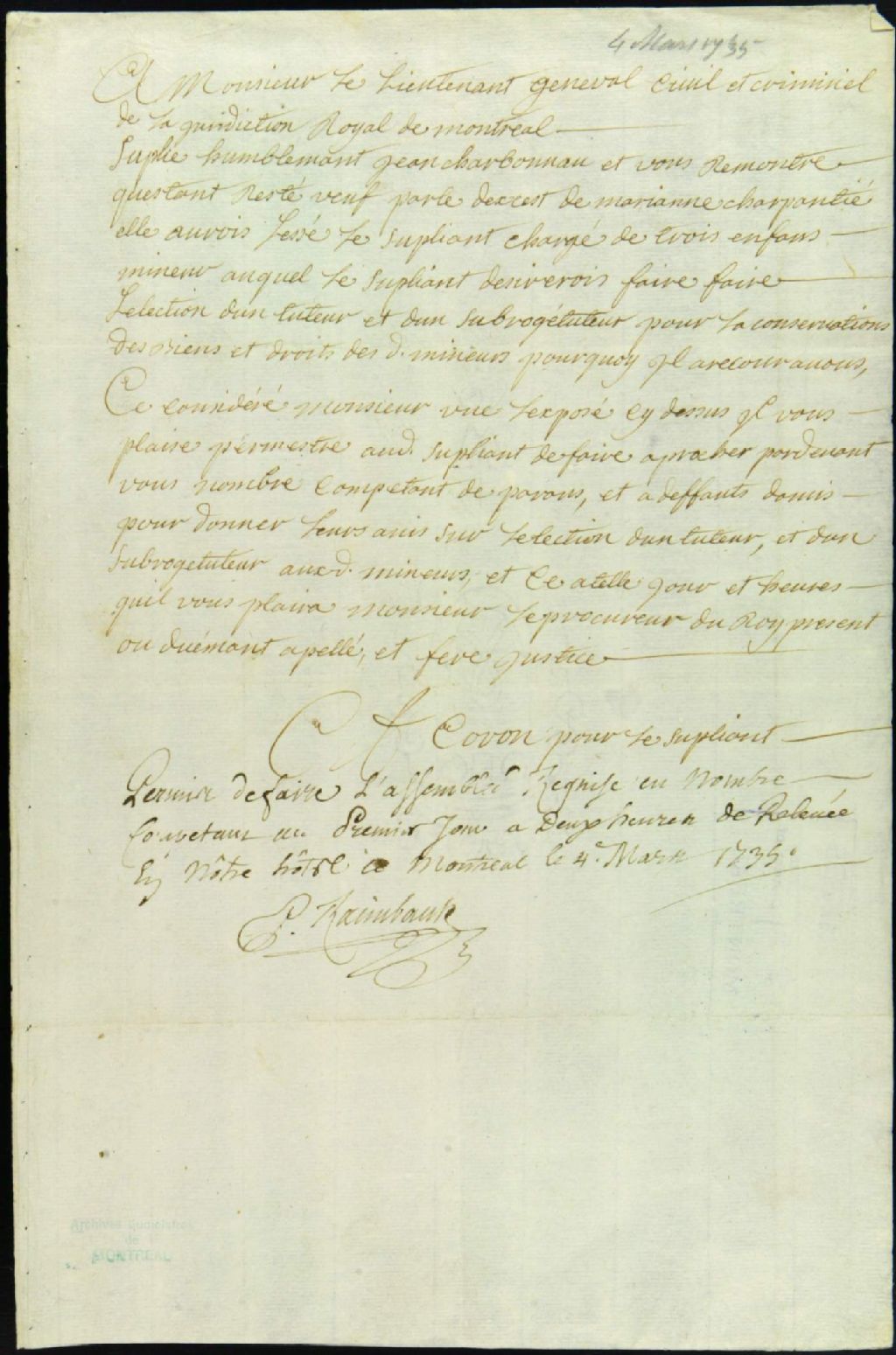 Tutelle des enfants mineurs de Jean Charbonneau et feu Marie-Anne Charpentier, 4 mars 1735, Archives nationales à Montréal, Fonds Juridiction royale de Montréal, (06M,TL4,S1,D4219).