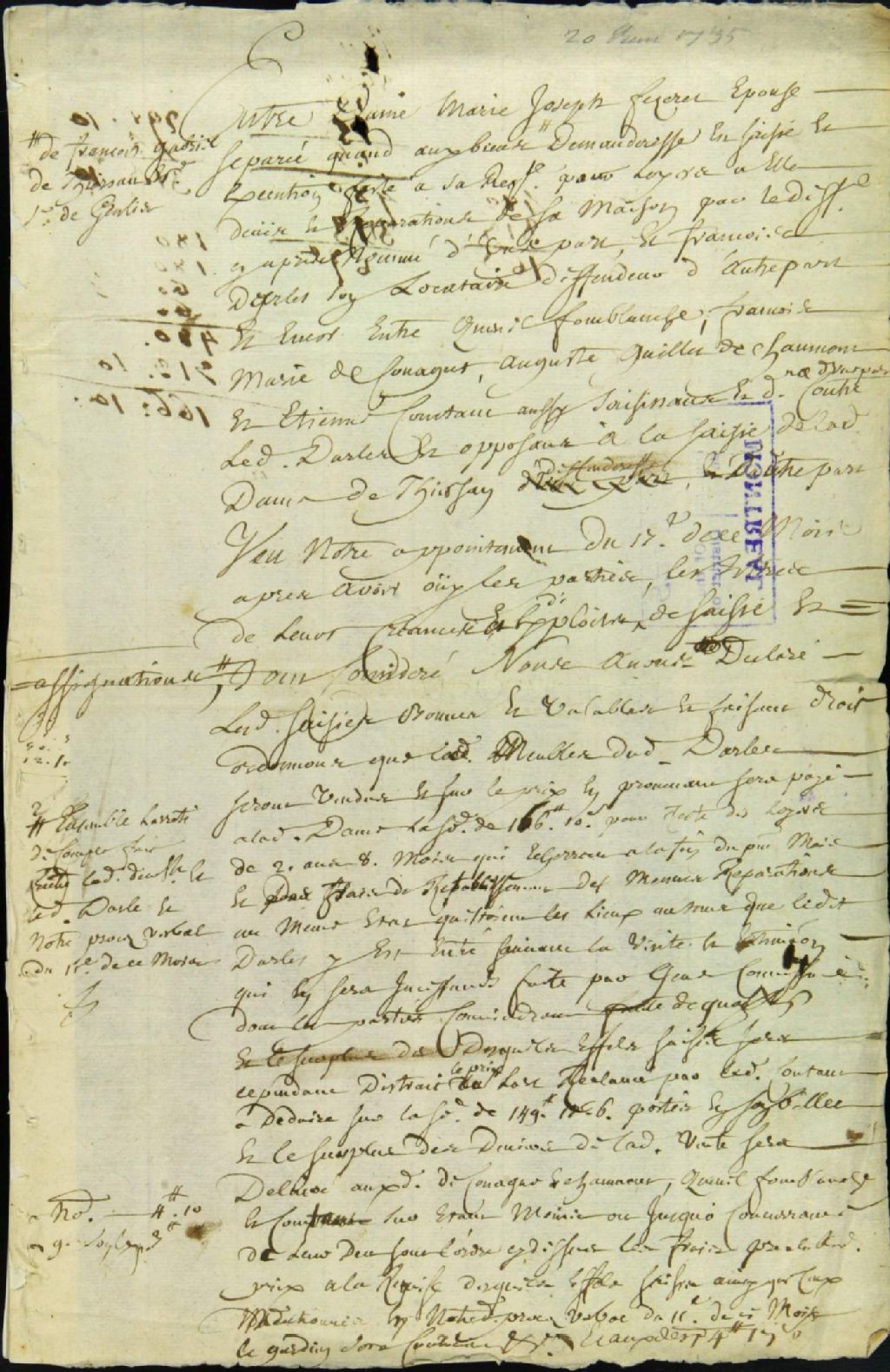 - Ce dossier de matière civile est composé des pièces suivantes : le brouillon d'une sentence de saisie " bonne et valable " sur les biens de François Darle, en faveur Marie Fezeret, pour retard dans le paiement de ses loyers ; la requête de Pierre Rebel dit Larose, aubergiste, comme opposant à la délivrance des deniers provenant de la vente des biens de Darle et de la femme Larchevêque, pour paiement de fournitures de vin ; les procès-verbaux de la présentation du rapport des experts sur l'état de la maison louée et par Paul Jourdain dit Labrosse et François Petit, experts ; l'état des meubles que Marie Desmarais a laissé dans la maison de Thiersant, comprenant 19 items (meubles et accessoires domestiques) ; la procuration de Marie Desmarais à son beau-frère Charles Rivet, pour s'opposer à la vente par décret ; la sentence pour l'appointement des soldats qui ont été témoins de la fourniture de vin à Darle ; le serment et les déclarations des soldats et livreurs Mousfé dit Brindamour, soldat de la Compagnie de Budemont et Joseph Fergereau dit Saint-Michel, soldat de la Compagnie de LaPerrière ; la signification à de Thiersant ; les conclusions et le réquisitoire du procureur du roi ; la sentence de mainlevée sur la saisie de la dame de Thiersant ; l'ordre pour une nouvelle expertise ; l'état des meubles de la femme Larchevêque, saisis par la dame de Thiersant ; la réception de caution judiciaire ; la déclaration de François Darle, peu avant son exécution, au sujet des transactions avec la dame de Thiersant ; la déclaration d'Antoine Letellier, disant ne requérir aucun salaire pour avoir été le gardien des meubles ; la requête de Pierre Rebel pour faire approcher Rivet ; la déclaration de ce dernier ; l'acte de départ par la dame de Thiersant pour le Conseil Supérieur de Québec ; et la sentence d'ordre et distribution entre les créanciers de Darle et de la dame Larchevêque. Auguste Guillet de Chaumont, notaire, Étienne Content et François de Couagne, sont mentionnés comme opposants dans ces documents