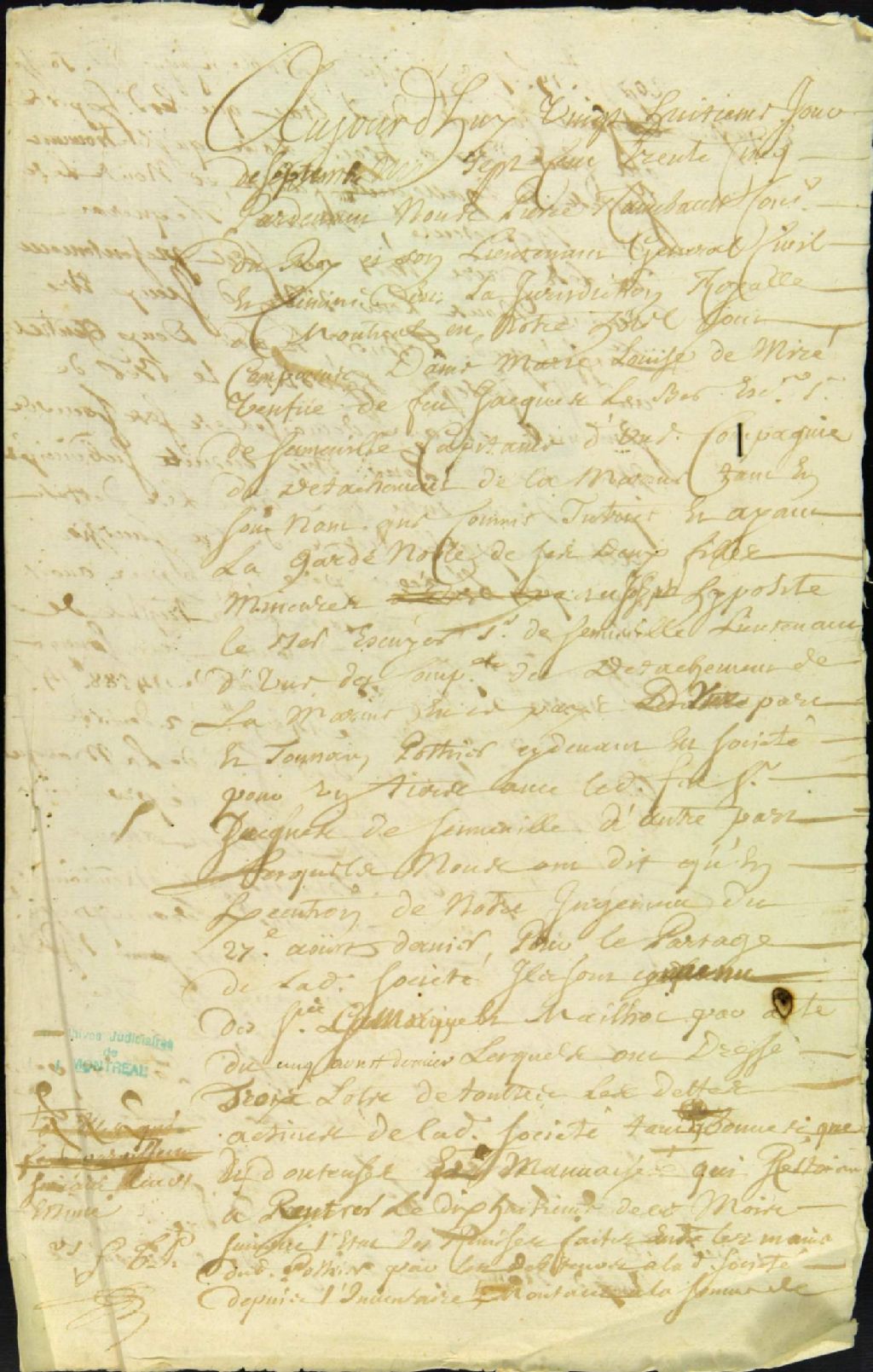 - Ce dossier de matière civile est composé des pièces suivantes : la requête de Marie-Louise de Miray de Largenterie, veuve de Jacques Leber, et de Joseph-Hippolyte Leber, lieutenant aide major, pour faire le partage judiciaire des biens de la succession dudit Jacques Leber ; l'ordonnance pour procéder au partage ; la requête de Toussaint Pothier, sociétaire avec le défunt Jacques Leber, pour faire le partage des marchandises et les comptes de ladite société ; le consentement d'Hippolyte Leber et de Marie-Louise de Miray, sujet à arbitrage ; l'accord pour faire le partage par les arbitres Ignace Gamelin, fils, et Charles Nolan de Lamarque ; l'ordre de faire le partage des marchandises et de recevoir le serment des arbitres ; ledit serment ; le rapport du partage des marchandises par Gamelin et Lamarque, contenant dans le bas plusieurs quittances de l'année 1736 et 1738 ; le brouillon de sentence de partage ; la convention entre les héritiers de Leber et Toussaint Pothier pour le choix d'arbitres qui sont François Maillot et Charles Nolan Lamarque ; la sentence de partage de la société entre feu Leber et Toussaint Pothier ; la quittance d'Hippolyte Leber à ce dernier ; une autre quittance signée le 22 septembre 1738 ; les états de compte de ce que la dame de Miray a payé pour la succession depuis la confection de l'inventaire et de ce qui fut perdu et consommé depuis ladite confection ; le procès-verbal du partage des biens de la société par les arbitres Lamarque et Maillot ; le brouillon de sentence de partage ; les pétitions de la veuve Leber et d'Hippolyte Leber ; la transcription d'une sentence de partage et l'homologation du partage des dettes de la succession ; la liste des dettes actives de cette dernière ; et le compte d'Hippolyte Leber avec madame de Senneville pour la succession de son père. On mentionne aussi Charles Lemoine, baron de Longueuil, en tant que subrogé tuteur dans ces documents