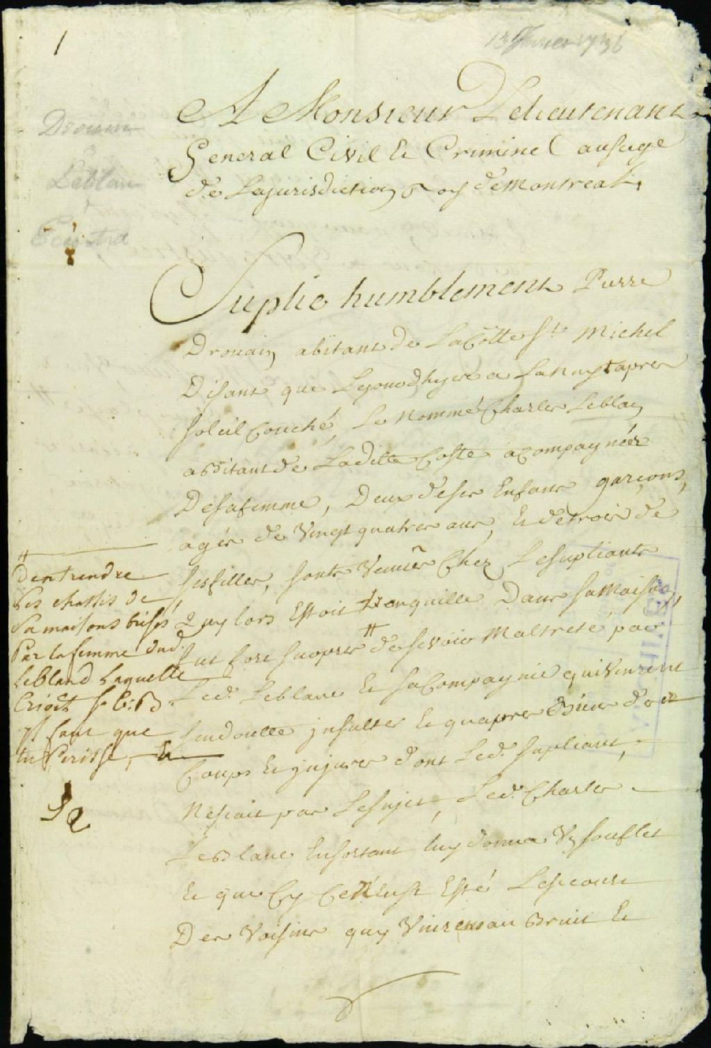 - Procès entre Pierre Drouin, cabaretier, habitant de Côte-Saint-Michel, plaignant, et Charles Leblanc et Suzanne Bon, accusés de voies de fait