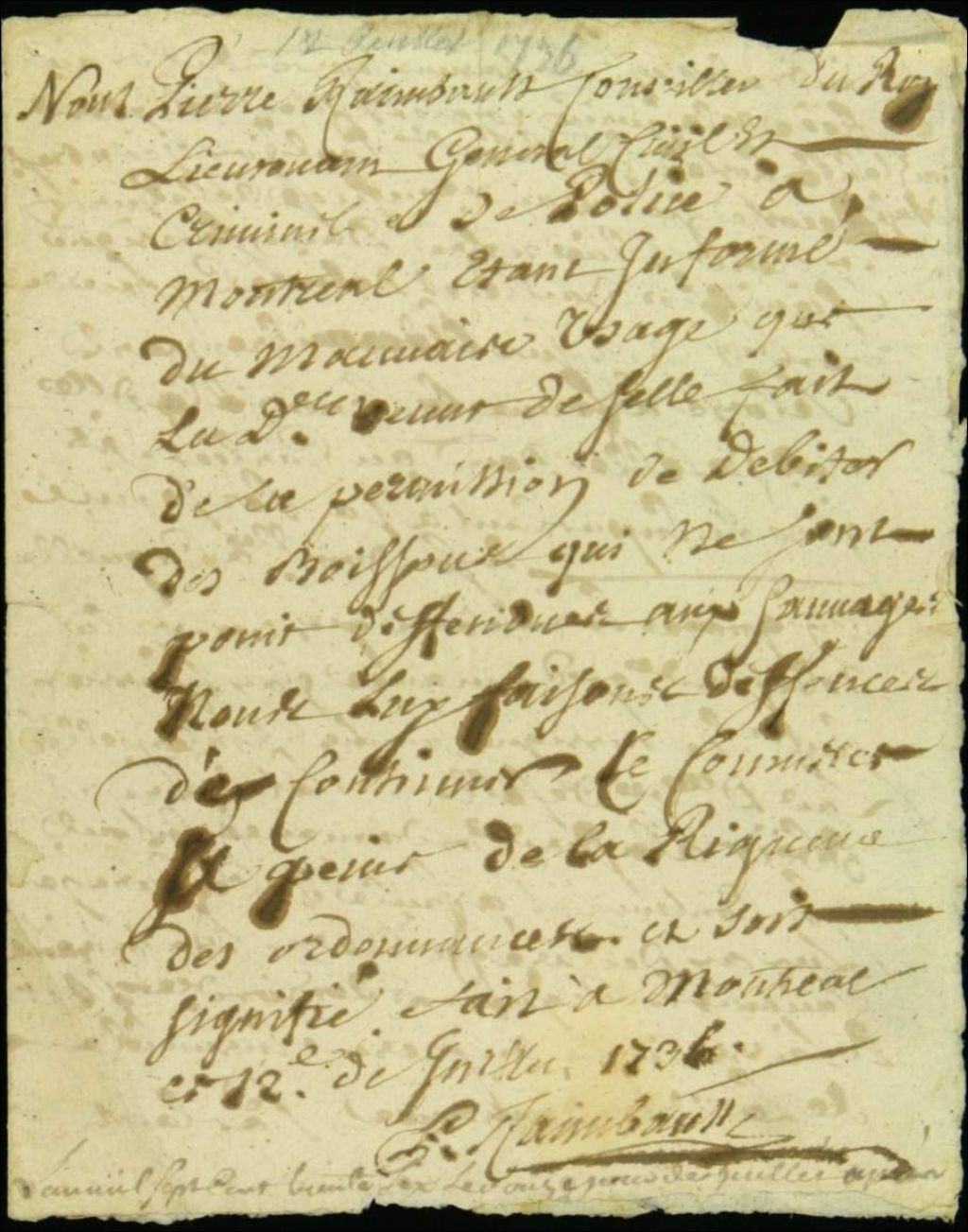 - Ce dossier d'administration civile se compose des pièces suivantes : l'annulation du permis de débit de boisson de la veuve [Deselle?] par le lieutenant général pour en avoir fait mauvais usage et avoir vendu de l'eau de vie aux sauvages; et la signification