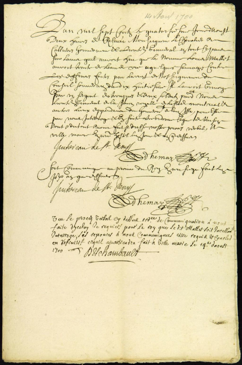 - Ce dossier de matière criminelle est composé des pièces suivantes : le compte rendu d'arrestation ordonnée par le chevalier de Callière, gouverneur, lequel envoie en prison Louis Mallet de Lachine, accusé d'avoir enfreint le règlement du Conseil Souverain ; la communication au procureur du roi lequel requiert l'interrogatoire de l'accusé ; l'interrogatoire de Louis Mallet par le lieutenant général et la communication de l'interrogatoire au procureur du roi ; les conclusions de ce dernier ; et la sentence qui condamne Mallet à payer 500 livres d'amende qui seront distribuées aux pauvres et à l'hôpital
