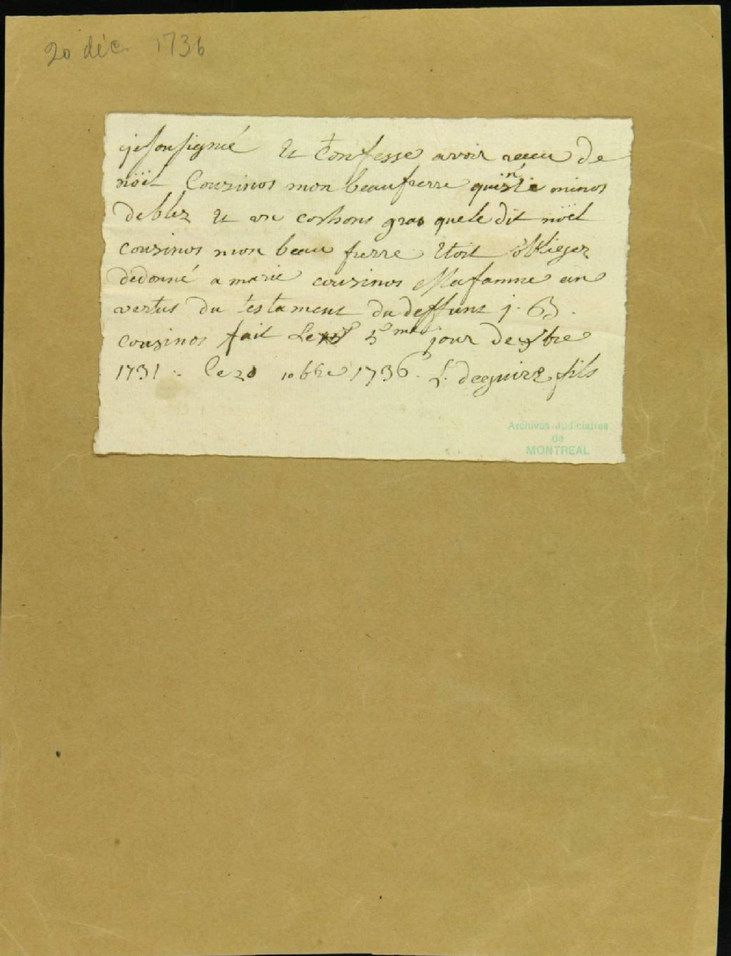 Quittance de Louis Deguire, fils, à son beau-frère Noël Cousineau pour du blé et un cochon, 20 décembre 1736, Archives nationales à Montréal, Fonds Juridiction royale de Montréal, (06M,TL4,S1,D4388).