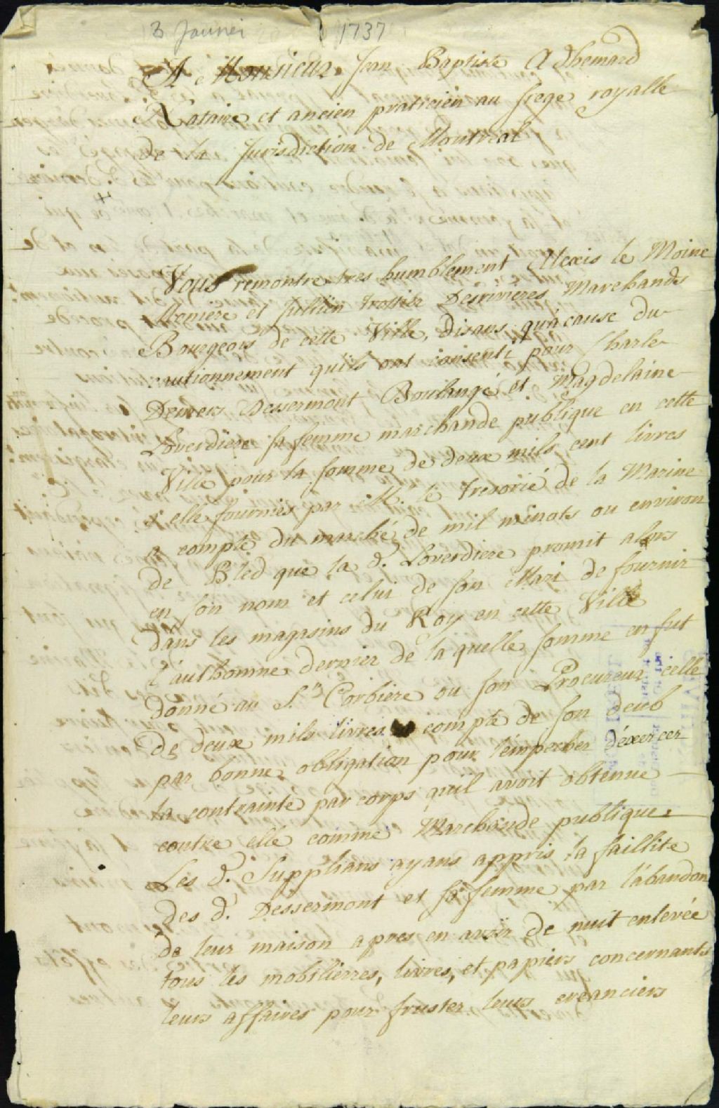- Ce dossier de matière criminelle est composé des pièces suivantes : la plainte d'Alexis Lemoine et de Julien Trottier contre Madeleine Cauchon dit Laverdière, 59 ans, et son époux Charles Demers dit Dessermons, 70 ans, accusés d'avoir détourné et enlevé nuitamment de leur maison saisie, des effets, meubles et papiers servant de garantie à leur caution de 2100 livres qu'ils ont donnés sur l'exécution d'un contrat entre eux-mêmes et le roi pour la fourniture de 1000 minots de blé, sur lequel marché ils ont touchés une avance de 2000 livres ; la permission de faire assigner Catherine Demers, 38 ans, qui a retiré la meilleure partie des effets ; l'ordonnance et le rapport qui s¿en suivent ; l'ordre pour réassigner les témoins non comparants ; l'information judiciaire ; la requête pour l'écrou des accusés ; le décret d'emprisonnement de ces derniers et pour la comparution des autres personnes impliquées ; le rapport de la signification dudit décret ; les interrogatoires de Charles Demers dit Dessermons, Madeleine Laverdière, Marie-Catherine Demers, Charles Douillard dit Laprise, 35 ans, Charles Demers, fils, 37 ans, et Louis Ménard, 56 ans ; les déclarations de Madeleine Laverdière ; la requête du procureur du roi pour la suspension de la procédure jusqu'à l'arrivée du commissaire ordonnateur ; le décret d'élargissement des accusés Demers et Laverdière, sujet à caution ; l'ordonnance subséquente ; et la transcription collationnée d'un marché passé devant le notaire Dulaurent entre Laverdière et sa majesté.Le dossier contient ensuite : la requête de René Gaudron de Chevremont, commis au conseil de la marine, pour faire assigner Demers et sa femme, pour qu¿il livre 1000 minots de blé à sa majesté ; la signification ; la réponse faite par Charles Demers sur la requête du Conseil de la marine ; l'ordonnance de Honoré Michel de LaRouvillière, ordonnateur de la marine, pour se faire remettre les 2000 livres par Lemoine Monière et Trottier en vertu de leur cautionnement ; la sentence condamnant Lemoine Monière et Trottier à rembourser 2000 livres par voie de saisie ; le mémoire des meubles pris, signé par Marie-Josèphe Demers ; les recommandations sur les registres des geôles ; la lettre de Monière et Trottier au juge Adhémar ; l¿ordre d¿assigner les témoins pour supplément d¿information ; l¿addition d¿information ; les requêtes de Trottier et Monière pour faire répéter les témoignages et pour faire condamner tous les intervenants qui ont enlevés des meubles chez Demers et Laverdière, conjointement avec les accusés ; les conclusions du procureur du roi ; la sentence condamnant Demers et sa femme à indemniser Lemoine Monière et Trottier solidairement avec ses enfants ; la liste des frais de justice ; le mémoire des fournitures faites par Lemoine depuis que Demers et sa femme sont en prison ; et l'acte de départ au greffe de Montréal par Lemoine Monière et Trottier disant faire envoyer la procédure au Conseil Supérieur de Québec. Ils protestent des frais contre les accusés. Les documents mentionnent les témoins suivant : Madeleine Arrivé, veuve de Jean Fontenelle, 69 ans ; Jacques Quesnel dit Fonblanche, 52 ans ; Jean-Baptiste Rapin, 22 ans, cordonnier de Lachine ; François Lalonde, 38 ans, de l'île Perrot ; Guillaume Lalonde, 30 ans, de l'île Perrot ; et Jean-Baptiste Robin, 40 ans, charroyeur d'eau