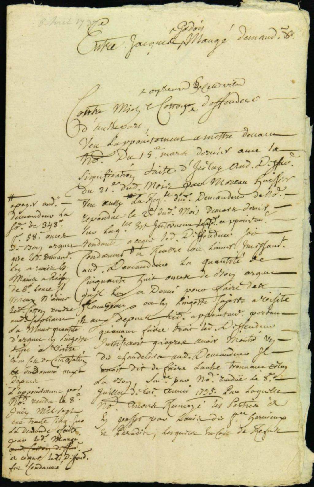 Procès entre Jacques Gadois dit Mauger, demandeur, et Michel Coton, orfèvre, défendeur, pour la restitution d'un flambeau et de lingots d'argent, 8 avril 1737 - 30 octobre 1737, Archives nationales à Montréal, Fonds Juridiction royale de Montréal, (06M,TL4,S1,D4421).