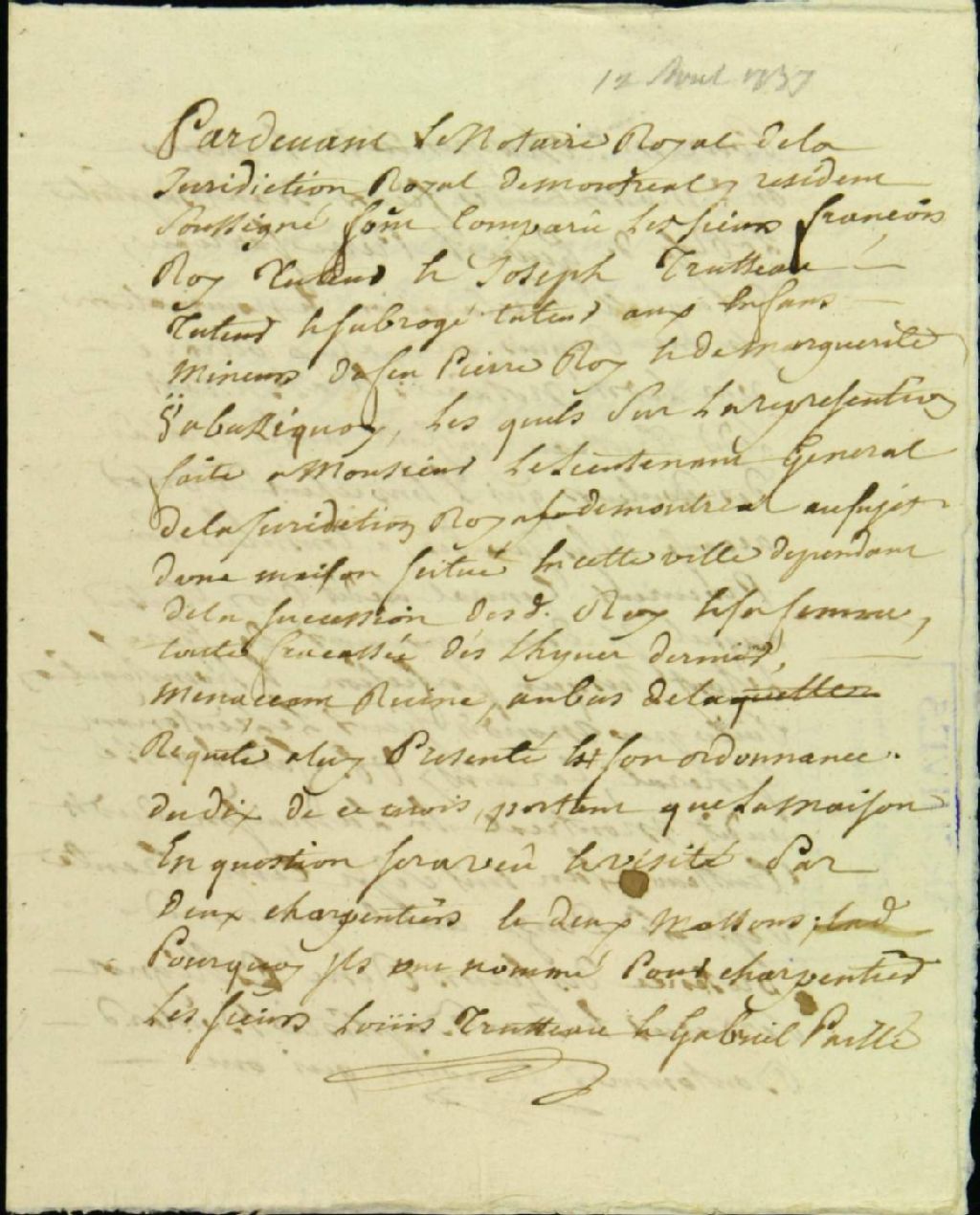Tutelle des enfants mineurs de feu Pierre Roy et Marguerite Ouabankékoué, 12 avril 1737 - 16 avril 1737, Archives nationales à Montréal, Fonds Juridiction royale de Montréal, (06M,TL4,S1,D4424).