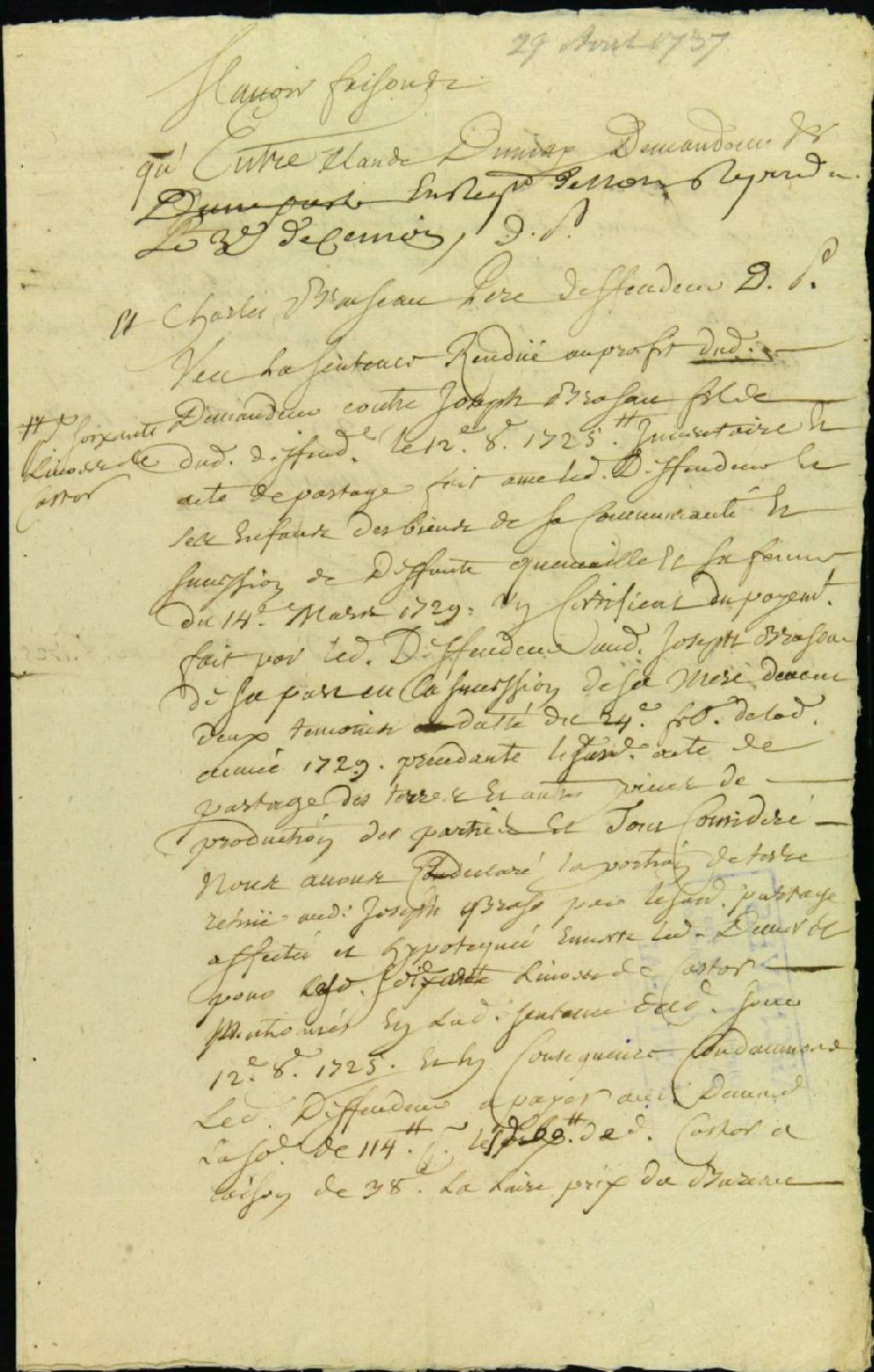 Procès entre Claude [Demers?], demandeur, et Charles Brazeau, veuf de Geneviève Quenneville, défendeur, pour le paiement d'une hypothèque, 29 avril 1737, Archives nationales à Montréal, Fonds Juridiction royale de Montréal, (06M,TL4,S1,D4429).