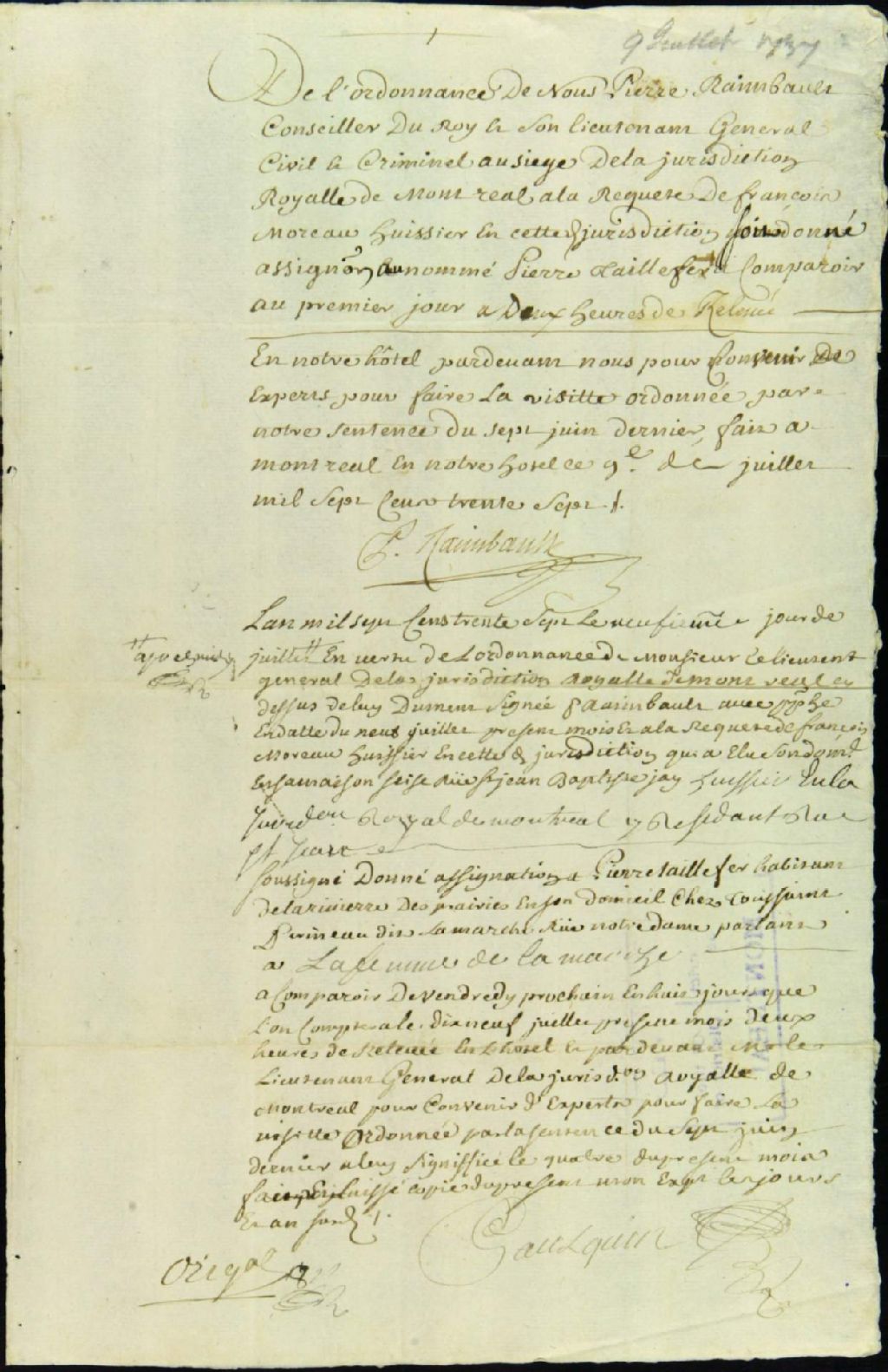 - Ce dossier de matière civile est composé des pièces suivantes : l'ordonnance pour assigner à comparaître Pierre Taillerfer à la requête de François Moreau pour convenir d'experts pour inspecter une maison de pieux, construite par Taillefer pour Moreau ; l'assignation par Saulquin ; la sentence de nomination des arbitres charpentiers Guillaume Tartre dit Larivière et Louis Chevrefils dit Bélisle ; le rapport de ces derniers sur la qualité des travaux jugés non-conforme ; et le procès-verbal de remise du rapport des arbitres. Claude Danré de Blanzy est mentionné comme procureur plaidant dans cette affaire