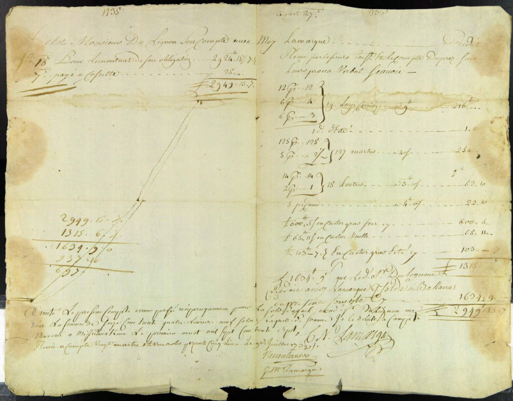 - Ce dossier de matière privée est composé des pièces suivantes : les pièces d'exhibits cotées 96 ; l'arrêté de compte de Dulignon envers Lamarque depuis l'année 1735 arrêté à Michillimakinac ; et le solde payable par obligation de 770 livres passée devant le notaire Lepailleur