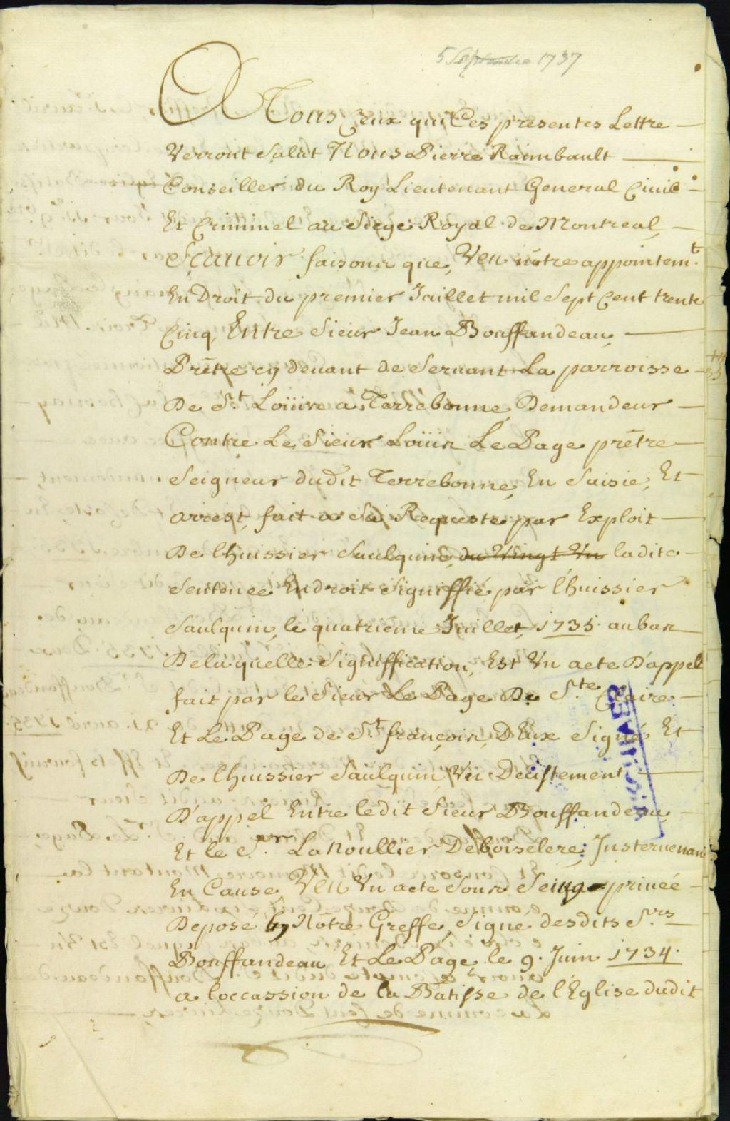 - Procès entre Jean Bouffandeau, prêtre desservant la paroisse de Saint-Louis de Terrebonne, demandeur, et Louis Lepage de Sainte-Claire , prêtre et seigneur de Terrebonne, défendeur, pour le paiement d'une obligation