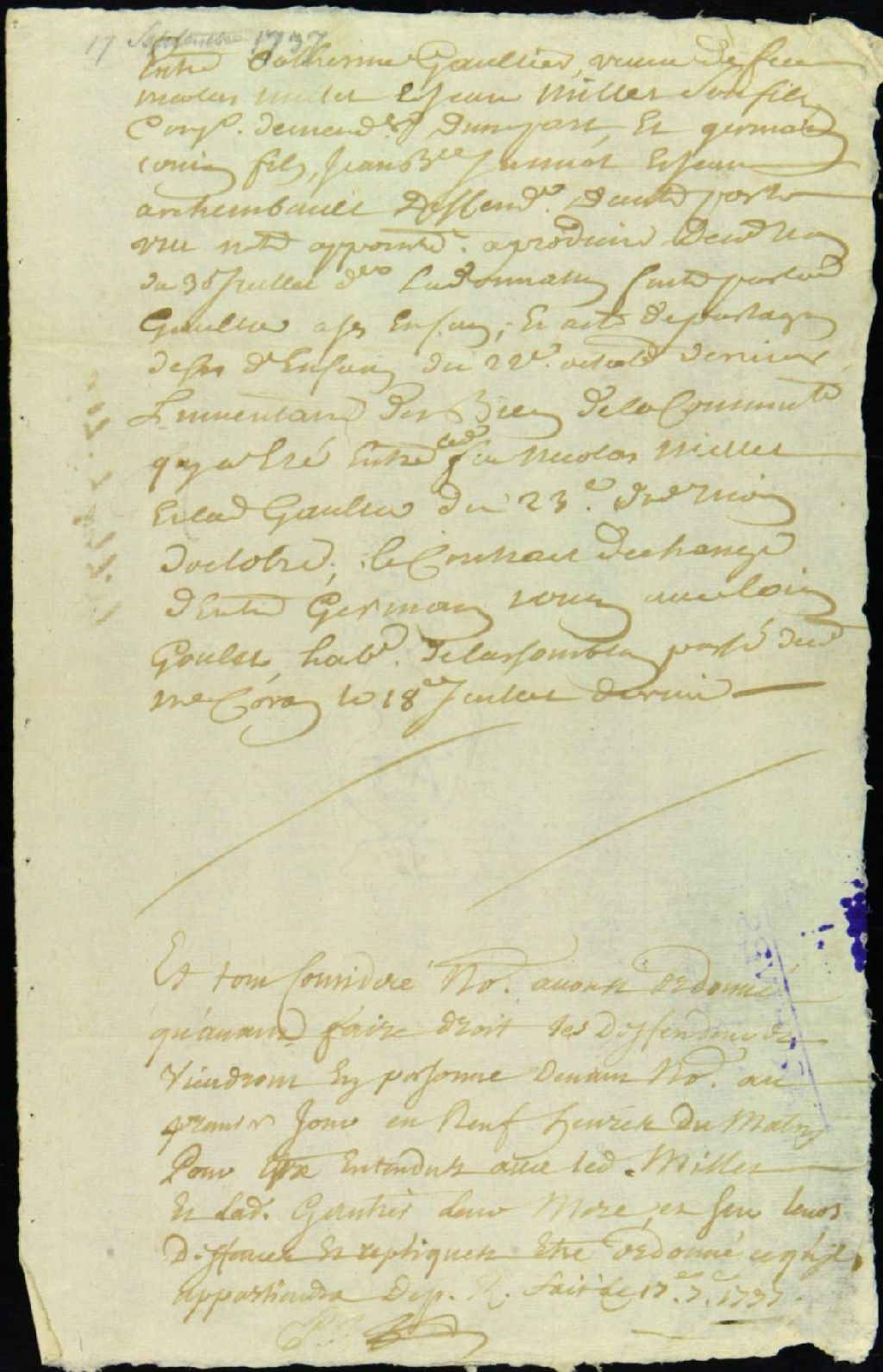 - Procès entre Catherine Gauthier, veuve de Nicolas Millet, et son fils Jean Millet, demandeurs, et Germain Thouin, fils, Jean-Baptiste Janot et Jean Archambault, défendeurs, pour un partage d'héritage