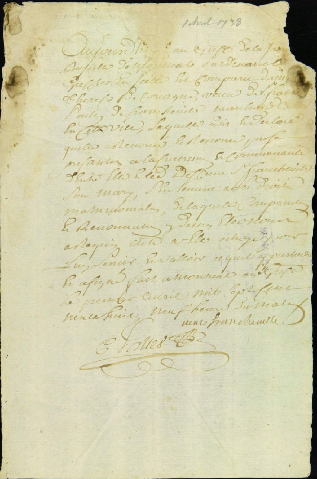 - Ce dossier d'administration judiciaire est composé de l'acte de renonciation enregistré au greffe par Thérèse de Couagne, à la succession de son défunt mari, François Poulin