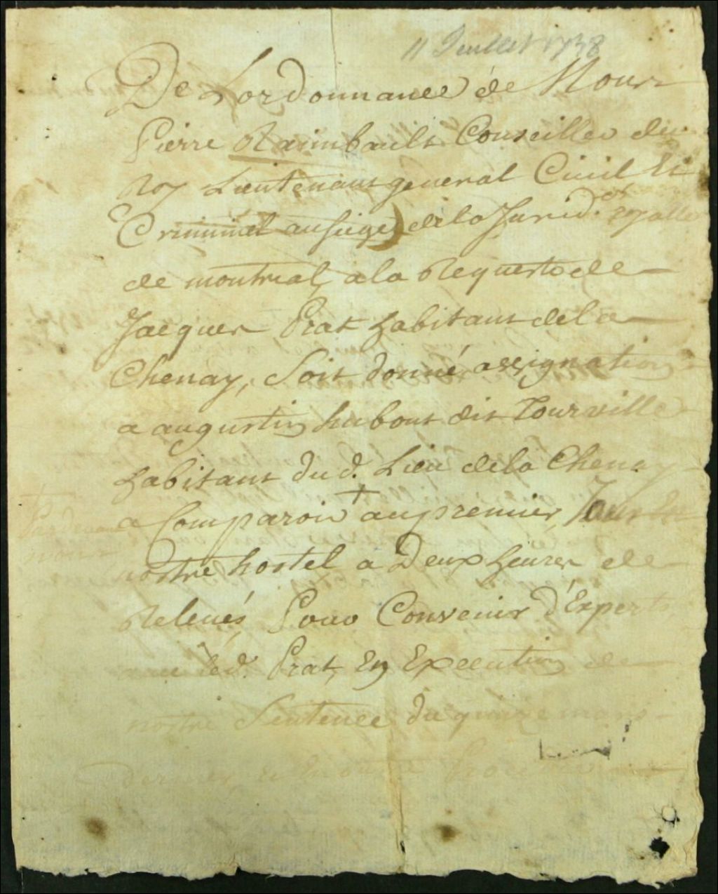 - Ce dossier de matière civile est composé des pièces suivantes : l'ordonnance pour donner une assignation à comparaître à Augustin Hubou, pour convenir de la nomination d'experts pour l'estimation de travaux exécuté conformément à une sentence, à la requête de Jacques Prat, procureur de Jacques Vaudry ; le rapport d'assignation le 16 juillet ; et la nomination des experts pour liquider les dédommagements et les intérêts