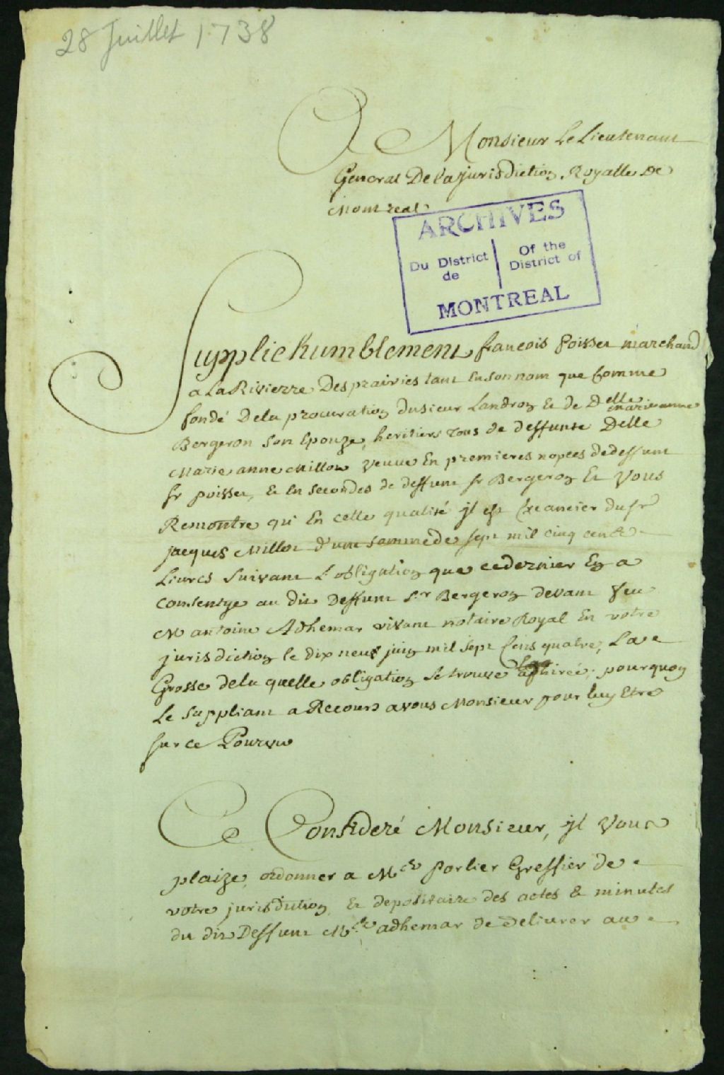 - Requête pour l'obtention d'une copie d'un acte d'obligation impliquant Jacques Milot de la part de François Poisset, marchand, procureur de Jean-François Landron et son épouse Marie-Anne Bergeron, héritiers de Marie-Anne Milot, veuve en première noce de François Poisset, épouse en seconde noce de Dominique Bergeron