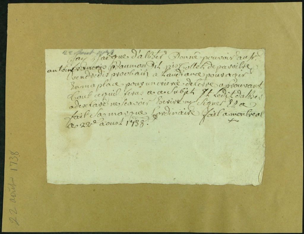 Procuration de [Jacques?] Dalbert à Antoine Beaumont dit Pistolet, 22 août 1738, Archives nationales à Montréal, Fonds Juridiction royale de Montréal, (06M,TL4,S1,D4587).
