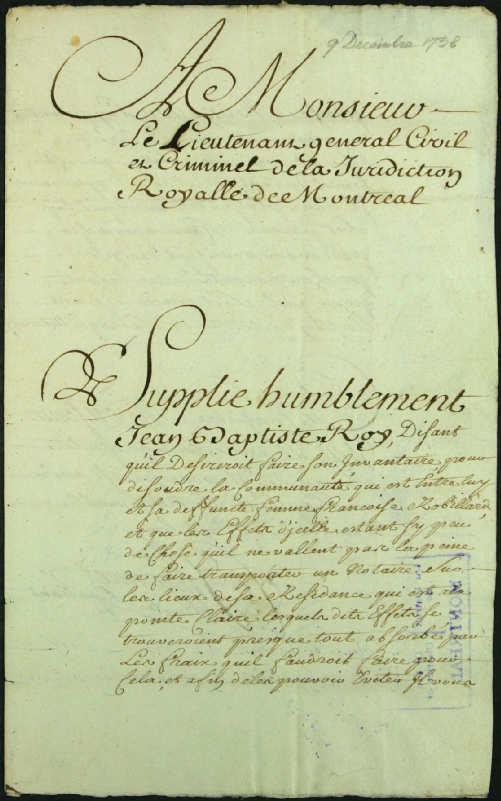 - Ce dossier d'administration judiciaire est composé des pièces suivantes : la requête de Jean Baptiste Roy pour faire l'inventaire en vue de dissoudre la communauté d'avec sa défunte épouse Françoise Robillard, devant le curé de la paroisse pour éviter les frais de déplacement d'un notaire, et la requête pour faire approcher les parents et amis en vue de faire élire un tuteur à ses enfants mineurs ; la permission de faire approcher les parents et amis ; et la déclaration du curé Gladel au sujet de la rédaction de l'inventaire. Le témoin signataire est Antoine Rapin, forgeron, et Nicolas Robillard est aussi cité