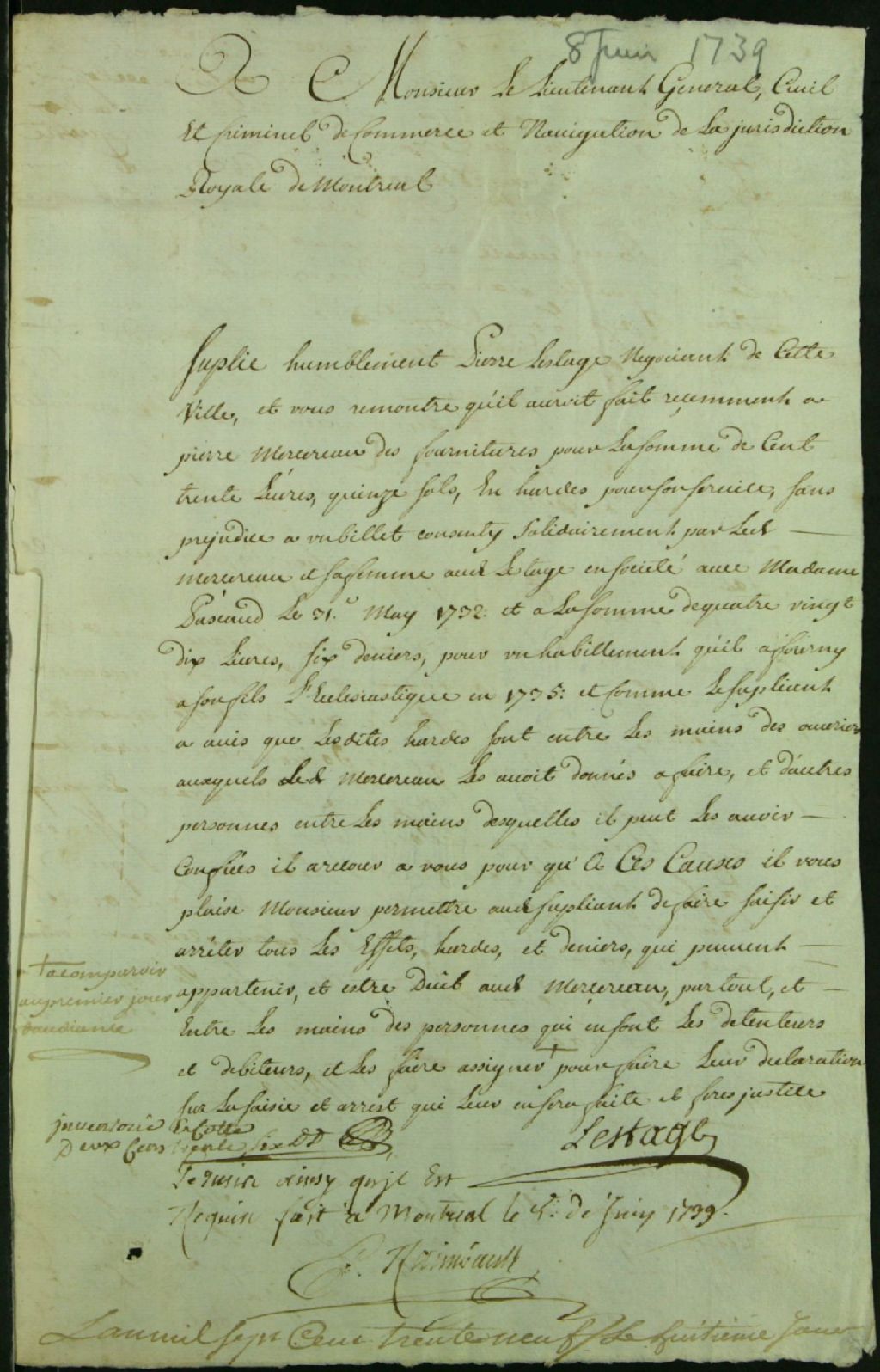 - Ce dossier de matière civile est composé des pièces suivantes : la requête de Pierre de Lestage pour faire assigner les personnes qui possèdent des effets qui appartiennent au défunt Pierre Mercereau et les faire saisir comme garantie du paiement d'un billet daté du 31 mai 1732 et d'un compte pour la fourniture d'habits d'ecclésiastiques à Louis Joseph, fils de Pierre Mercereau ; le rapport des saisies et d'assignations à Joseph Dufault, charpentier, au sieur Despointes, père, aubergiste, et au gouverneur Charles Lemoine de Longueuil, major ; la signification d'un billet daté du 31 mai 1732 à Jean-Baptiste Amiot, en sa qualité de tuteur des enfants mineurs de Pierre Mercereau ; l'état de compte de ce dernier envers de Lestage pour des fournitures d'habits d'ecclésiastique de son fils et pour la livraison d'articles fait sur les lieux de la construction d'un moulin à farine ; l'assignation à servie à Joseph Greenhill, tailleur, pour venir affirmer sur la saisie qui lui a été faite ; la transcription scellée d'une sentence qui condamne Amiot, en tant que tuteur des enfants mineurs de Pierre Mercereau, à payer les dettes du défunt et ordonne aux tierces parties saisies de remettre les effets et étoffes au greffe ; les significations ; l'affirmation de Despointes et la sentence pour le dépôt des effets au greffe ; et l'état de compte de la succession Mercereau envers de Lestage.Le dossier contient aussi : l'état de la vente des meubles, des effets et des hardes de Pierre Mercereau ; la quittance de Joseph Greenhill pour neuf livres reçues de Lestage, pour la confection d'un habit que feu Mercereau lui avait demandé de faire et qu'il a remis à de Lestage ; le contrat rédigé sous seing privé entre Pierre de Lestage et Pierre Mercereau, pour la construction d'un moulin à Pointe-Esther, près de la rivière Bayonne, à Berthier ; l'état des effets de Mercereau, reçus de diverses personnes et vendus par privilège ; les billets du 7 mars 1723, par Louise Guillemot, et du 31 mai 1732, par son époux Pierre Mercereau ; le petit mot de ce dernier demandant à Marie-Marguerite Mercereau, soeur Saint-Hyacinthe, de prier de Lestage de lui avancer tout l'habillement d'ecclésiastique nécessaire pour son neveu ; le reçu de soeur Saint-Hyacinthe à de Lestage pour la somme de 74 livres et dix sols de vêtements ; et la promesse de paiement de 72 livres à Mercereau, signé par Hertel de [Rouville?]. [Louis-Joseph?] Mercereau, prêtre bénéficiaire, et Marie-Josèphe, panise de Charles Lemoine, sont aussi cités dans ces documents