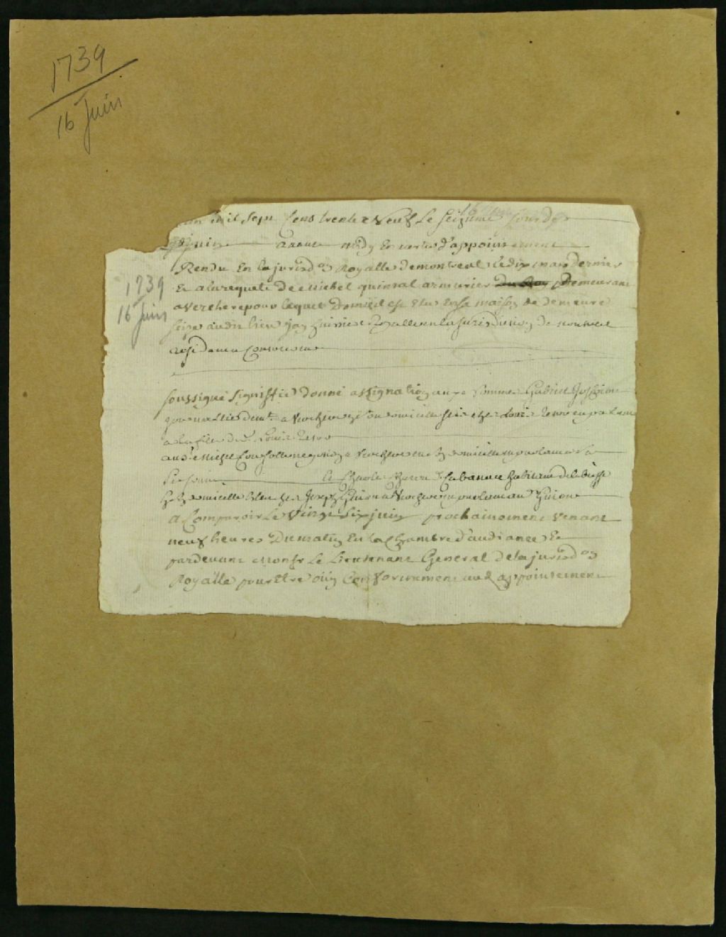 - Ce dossier de matière civile est composé des pièces suivantes : la signification d'une sentence d'appointement pour entendre les témoins dans une cause entre Michel Quintal et François Pineau, et les assignations à comparaître ; la transcription d'un extrait des registres sur l'audition des témoins et d'une sentence d'appointement ; la signification de la sentence et l'assignation à Michel Quintal ; l'ordonnance pour faire assigner les témoins que Pineau veut faire ouïr ; les assignations par Monmerqué, huissier ; l'enquête judiciaire les 13 et 14 juillet 1739 ; la sentence ; et l'acte de départ enregistré au greffe de Montréal par Michel Quintal, habitant de Verchères, afin de poursuivre son appel de sentence logée au Conseil supérieur de Québec.Les témoins sont Michel Coursol, négociant de Verchères ; Charles Charron dit Cabanac, de La Biosse ; Joseph Guyon, de Verchères ; J.-B. Casavant, âgé de 41 ans, de Verchères ; François Bleau, [...]