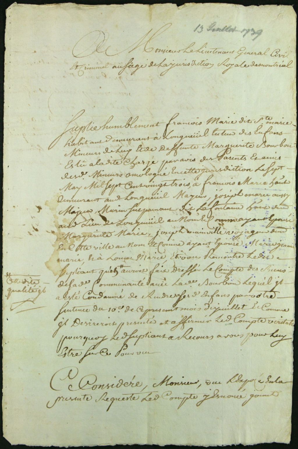 Tutelle des enfants mineurs de François Marie [dit Sainte-Marie] et de feu Marguerite Bourdon, de Longueuil, 13 juillet 1739 - 15 juillet 1739, Archives nationales à Montréal, Fonds Juridiction royale de Montréal, (06M,TL4,S1,D4649).