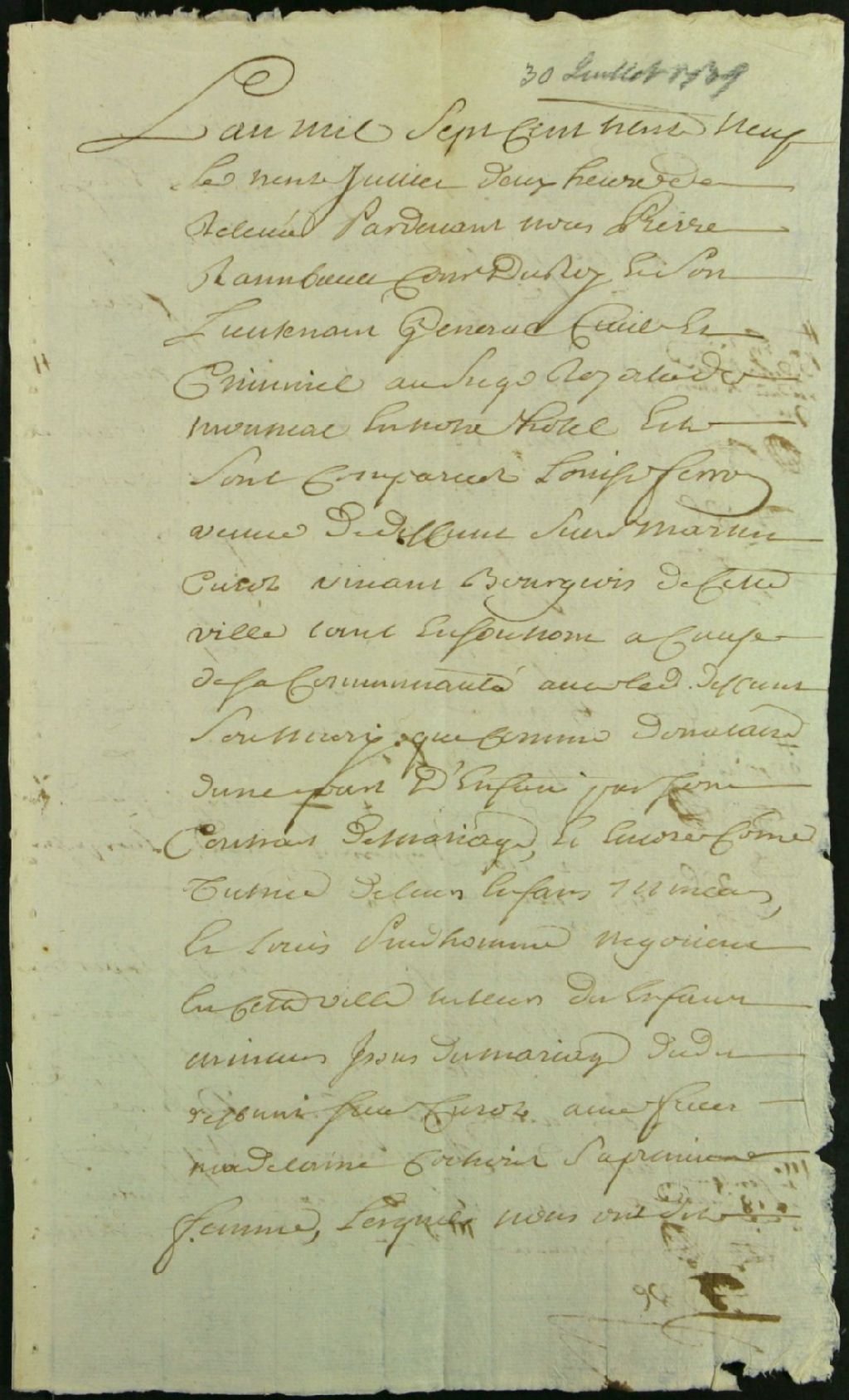 - Ce dossier d'administration judiciaire est composé des pièces suivantes : la nomination et le serment des experts Jean-Baptiste Adhémar et Claude Danré de Blanzy, notaires, pour procéder au partage des biens de feu Martin Curot, à la requête de Louise Ferron et de Louis Prudhomme, tuteur des enfants mineurs d'un premier mariage de Curot avec Madeleine Cauchois ; la requête de Ferron et Prudhomme pour faire approcher les experts choisis pour faire le partage de la propriété de feu Curot et leur faire prêter serment ; la prestation de serment des experts Charles Gervaise, boulanger, et Jean-Baptiste Lefebvre dit Angers, arpenteur juré ; le rapport des experts à l'effet que la propriété est indivisible et qu'il faut la vendre par licitation pour pouvoir procéder au partage des biens ; le dépôt du rapport ; le dictum de sentence pour la vente par licitation de l'emplacement et de la maison de pierre ; l'ordre de vendre la maison ; le rapport d'affiches ; la sentence d'ordre et de distribution des argents qui proviennent de la vente ; et la quittance de Prudhomme et Ferron à Nicolas-Joseph de Noyelles, capitaine, adjudicataire de la maison
