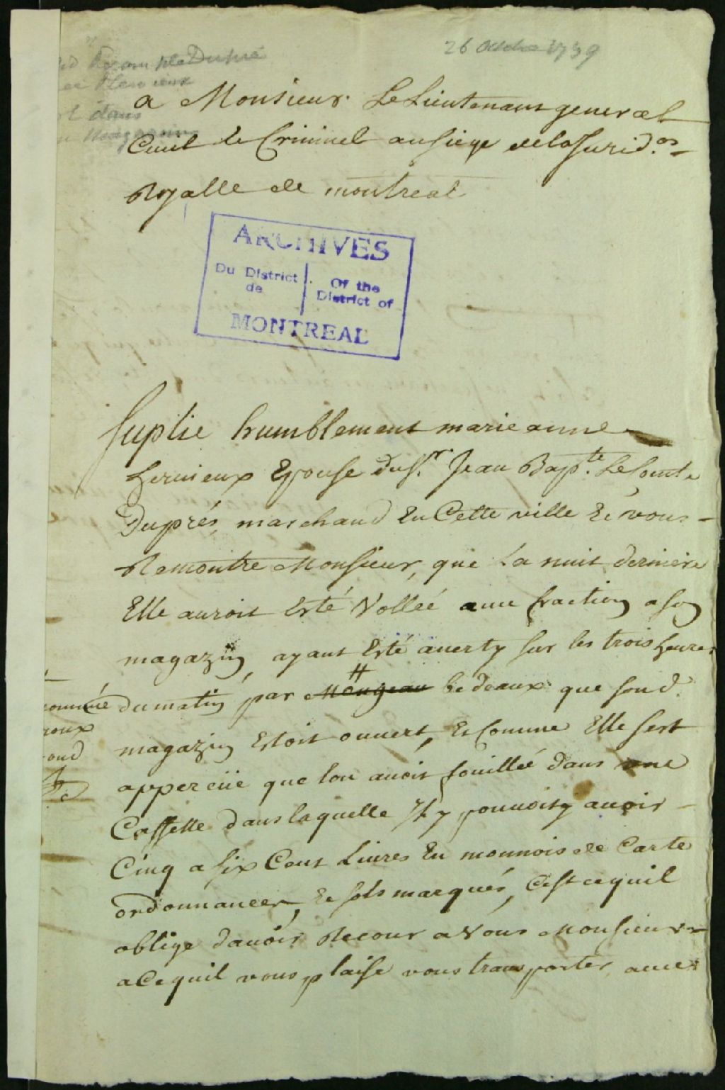 - Ce dossier de matière criminelle est composé des pièces suivantes : la plainte de Marie-Anne Hervieux, disant avoir été victime d'un vol par effraction dans son magasin, au cours de la nuit. Elle demande la visite du lieutenant général pour dresser le procès-verbal de l'effraction et du vol d'un montant de 500 à 600 livres dans sa caisse ; l'ordre de se transporter sur les lieux ; et le procès-verbal de la visite du lieutenant général sur les lieux du vol