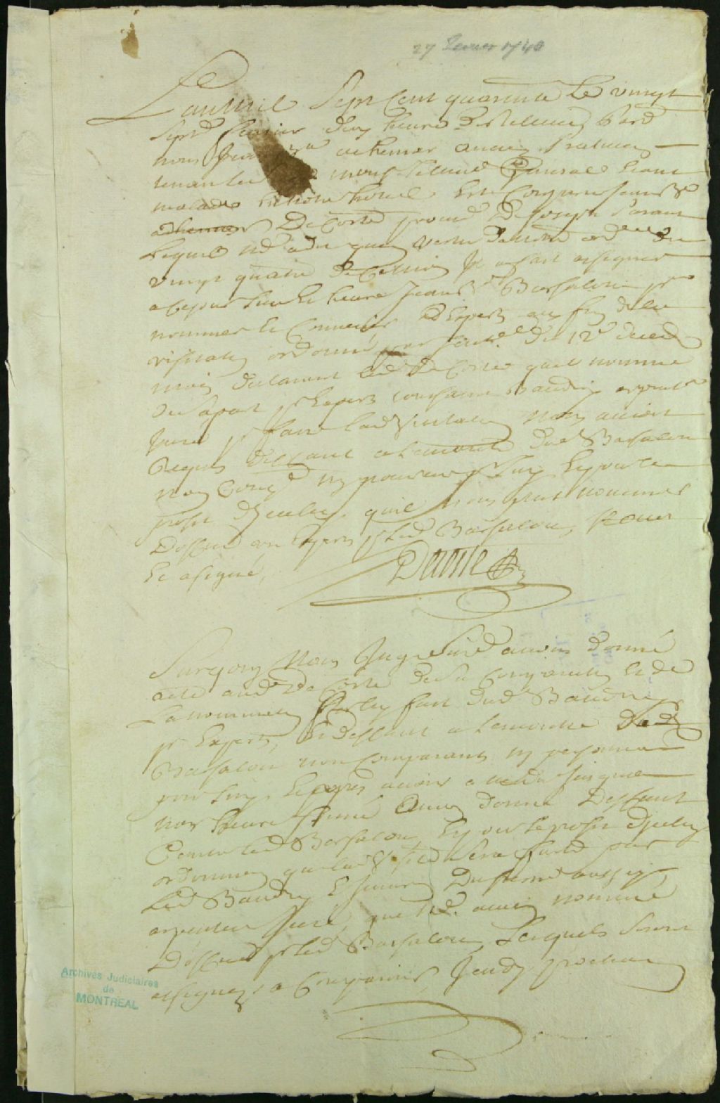 - Procès entre Joseph Parent, forgeron pour le roi, demandeur, et J.-B. Barsalou, marchand, tanneur, défendeur, pour l'abattage d'arbres sur une terre voisine, à Côte-Sainte-Catherine