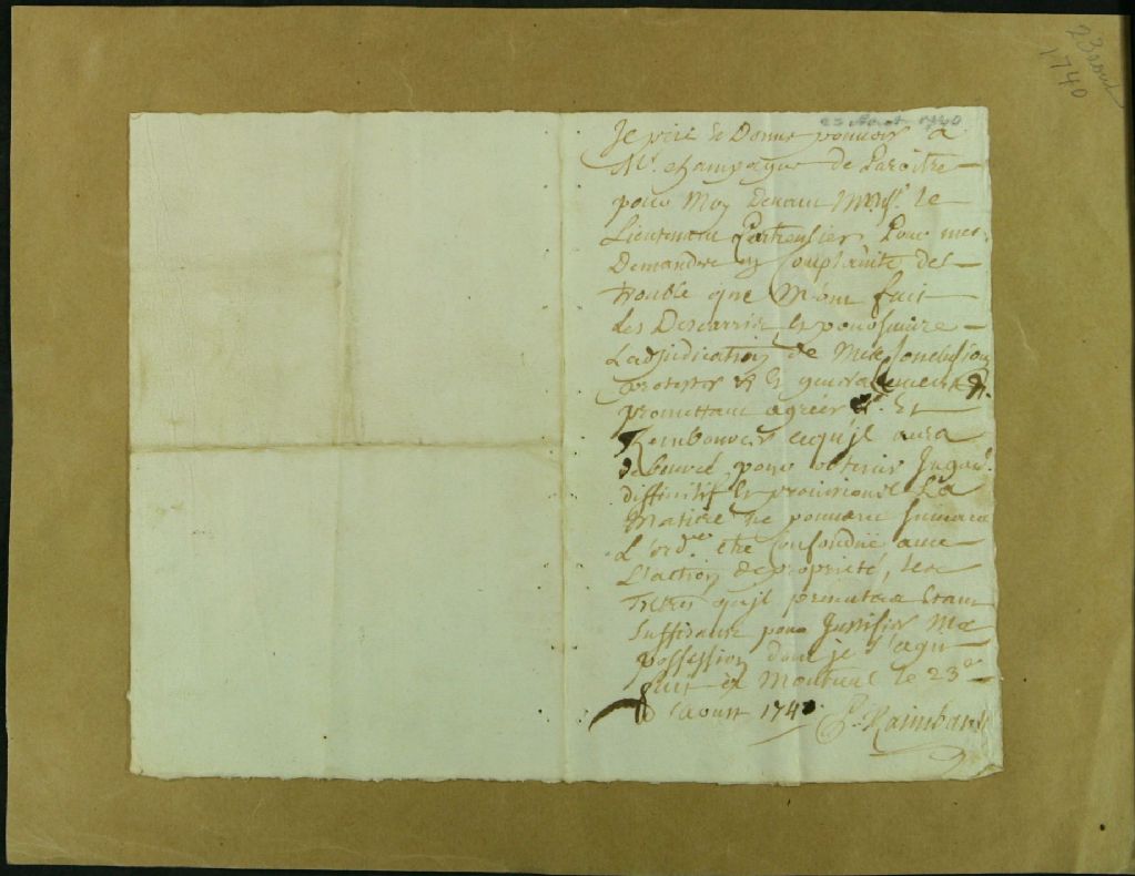 - Ce dossier de matière civile est composé des pièces suivantes : la procuration de Pierre Raimbault à François Massou [Masson] pour plaider dans une cause impliquant la famille Descaries ; le procès-verbal d'enquête ; l'enquête faite à la requête de Pierre Raimbault ; la sentence qui maintient Pierre Raimbault en possession du terrain contesté ; le mémoire de frais ; le procès-verbal du serment des experts appointés pour faire le bornage ordonné par sentence ; la remise du rapport de vérification de bornage par les arpenteurs Toussaint Beaudry, Pepin dit Laforce et J.-B. Lefebvre dit Angers ; l'opinion du procureur du roi à ce que la veuve Descaries et les héritiers soient mis en possession du terrain ; la sentence qui restitue à Marguerite et Marie Cuillerier la jouissance de leur terre suivant le bornage fait par les arpenteurs Angers et Péladeau le 30 juin dernier et qui condamne Louise Nafrechou à rendre les fruits récoltés ; la [...]