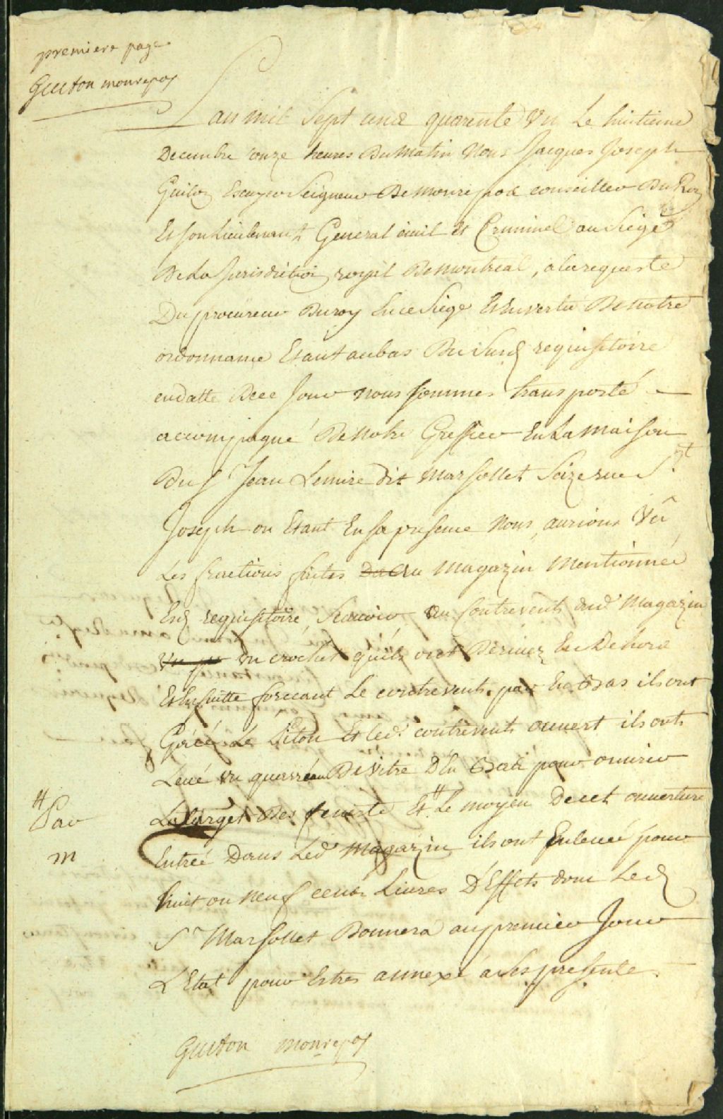 - Ce dossier de matière criminelle est composé des pièces suivantes : la requête du procureur du roi adressée au lieutenant général pour lui demander d'enquêter sur les lieux d'un vol par effraction perpétré au magasin de Jean Lemire dit Marsolet au cours de la nuit précédente ; le procès-verbal de la visite sur les lieux de l'effraction ; la communication du procès-verbal au procureur du roi, lequel requiert la tenue d'une information judiciaire ; les ordres de ce faire et pour faire assigner les témoins du procureur du roi ; le rapport d'assignation à comparaître ; et l'information judiciaire. Les témoins suivant sont mentionnés dans cette affaire : Pierre Puybaro, 57 ans, maître chirurgien à l'Hôtel-Dieu ; Jean-Marie Blondeau, 22 ans, pensionnaire chez Marsolet ; J.B. Lemire dit Marsolet, 25 ans ; Paul Leduc, 32 ans, demeurant chez Marsolet, son beau-père ; François Baribeau, 39 ans, pensionnaire chez Marsolet ; Rolland Paradis, 47 ans, de la rue St-Joseph ; et Louis Laferté dit St-Louis, 32 ans, soldat de la compagnie Sabrevois