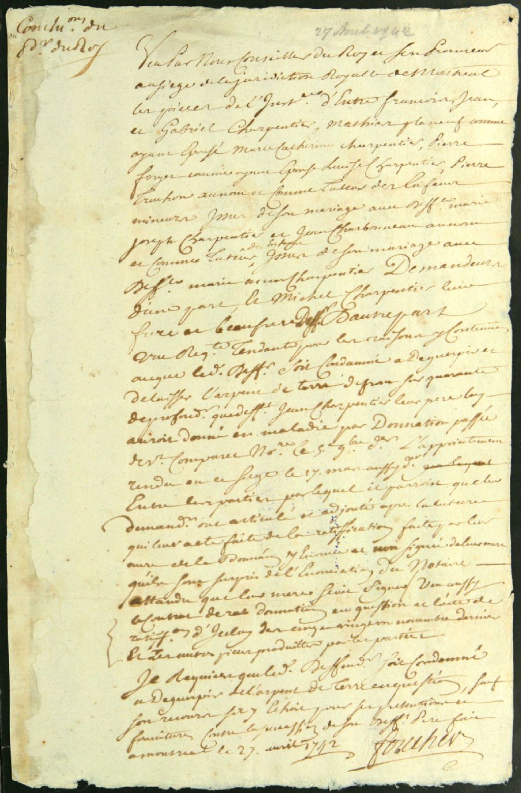 - Procès entre François, Jean et Gabriel Charpentier, Mathieu Phaneuf, époux de Catherine Charpentier, Pierre Forget, époux de Thérèse Charpentier et Jean Charbonneau, veuf de Marie-Anne Charpentier, demandeurs, et Michel Charpentier, défendeur, pour la restitution d'une terre provenant de l'héritage de Jacques Charpentier
