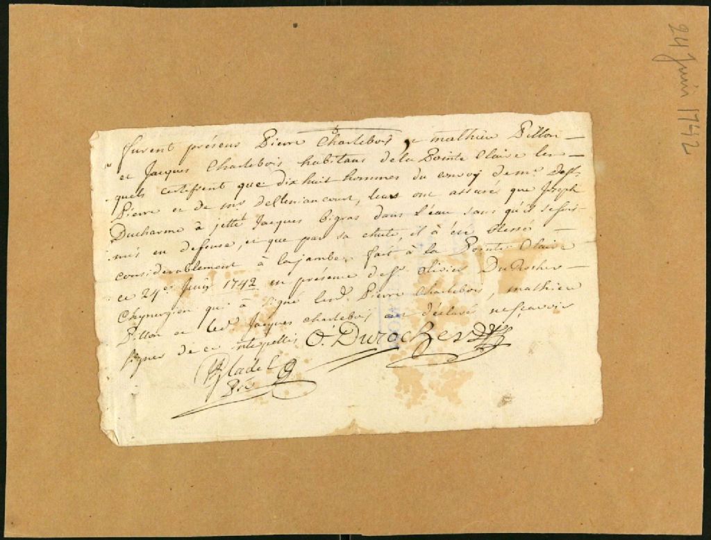 Procès entre Jacques Bigras, voyageur, habitant de Côte-St-Rémy, plaignant, et Joseph Ducharme, conducteur de canot, habitant de Lachine, accusé de voies de fait, 28 juillet 1742 - 5 mai 1743, Archives nationales à Montréal, Fonds Juridiction royale de Montréal, (06M,TL4,S1,D4866).