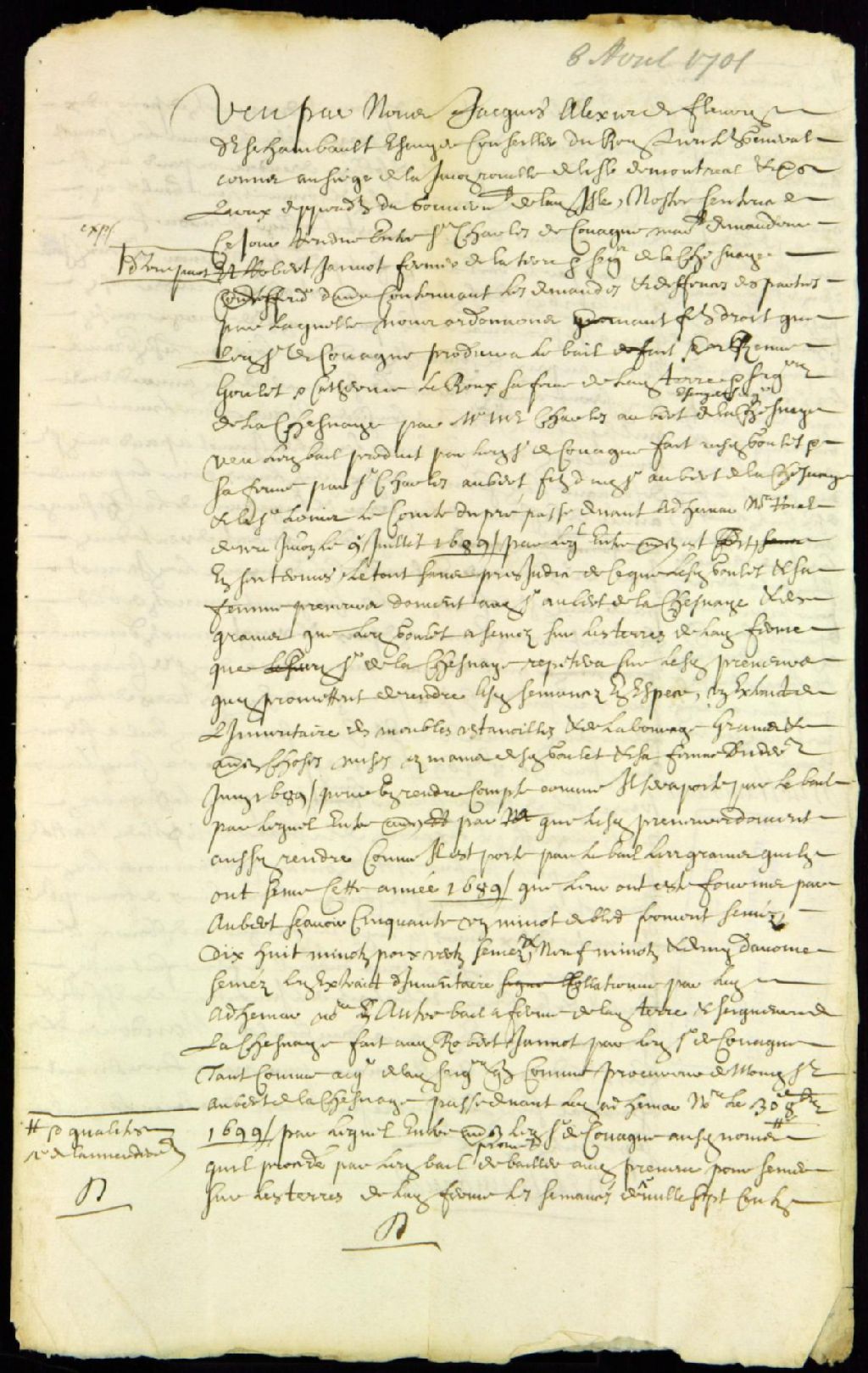 Procès entre Charles de Couagne, demandeur, et Robert Janot, fermier de la terre et seigneurie de Lachenaie, défendeur, pour le paiement de fermage, 8 avril 1701, Archives nationales à Montréal, Fonds Juridiction royale de Montréal, (06M,TL4,S1,D487).