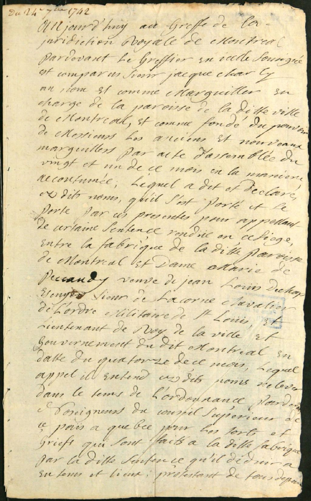 - Ce dossier de matière civile se compose de l'acte d'appel de sentence enregistré au greffe de Montréal par Jacques Charly, marguillier et fondé de pouvoir des marguilliers de Notre-Dame, contre la dame Marie de Pécaudy