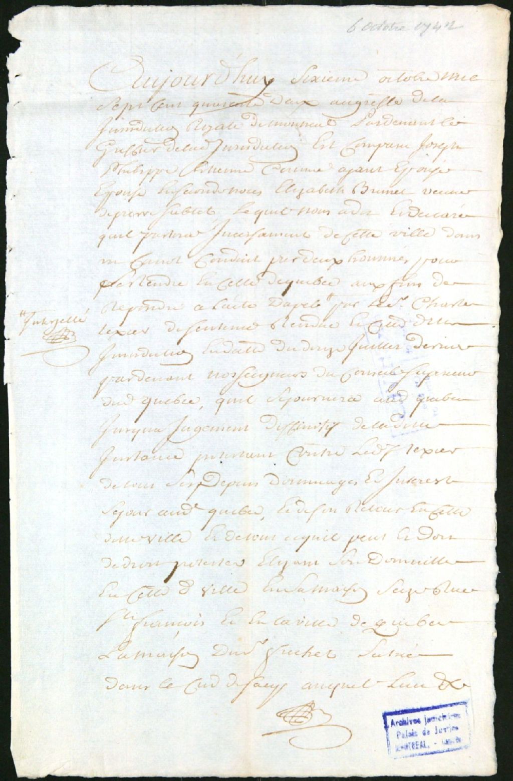 Procès en appel entre Charles Tessier, requérant, et Joseph-Philippe Étienne, époux en seconde noce de Élisabeth Brunet, intimé, 6 octobre 1742, Archives nationales à Montréal, Fonds Juridiction royale de Montréal, (06M,TL4,S1,D4887).