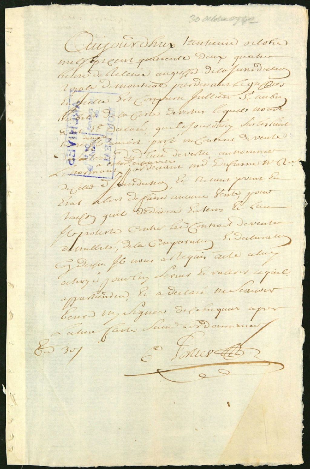 - Ce dossier d'administration judiciaire se compose de la déclaration faite au greffe par Julien Saint-Aubin, disant avoir été obligé de passer un contrat de vente pour sa terre de Côte-des-Vertus au nommé Lenormand [Le Normand?], cabaretier de cette ville. Il proteste de nullité, n'étant pas habilité à faire ladite vente
