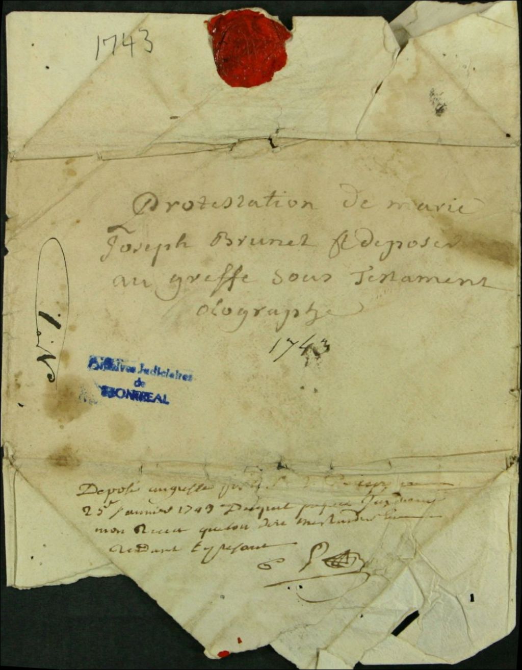 - Ce dossier d'administration judiciaire se compose des protestations de Marie-Josèphe Brunet, disant que la procuration qu'elle aurait accordée à Pierre Guilbault pour disposer de ses biens a été faite à son insu. Elle demande que les biens de l'héritage de son père, Joseph Brunet, lui revenant soient protégés